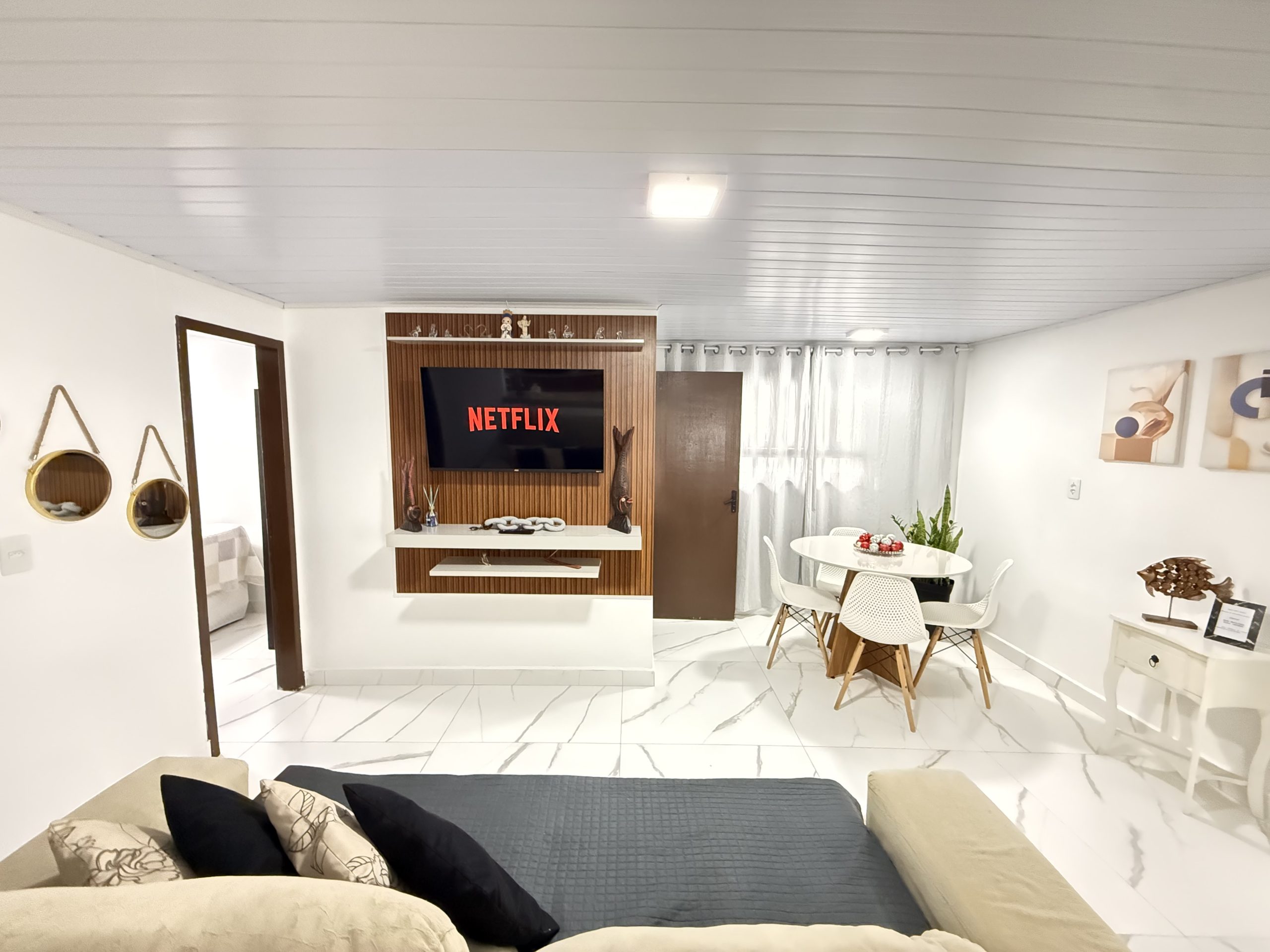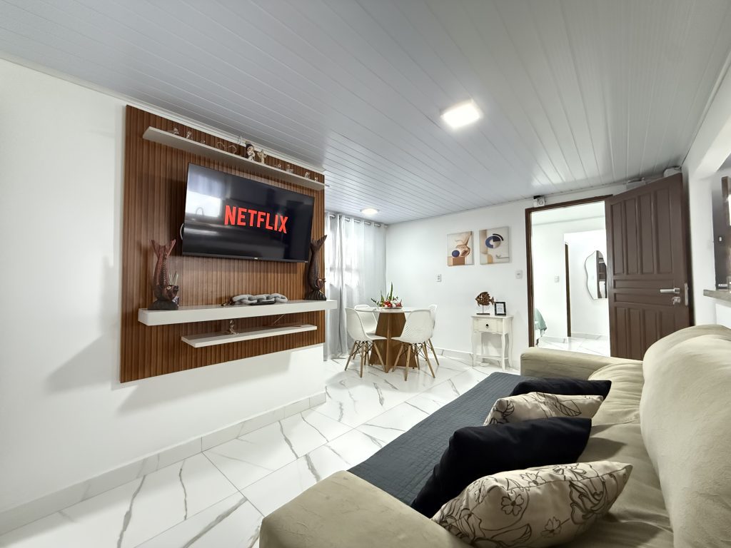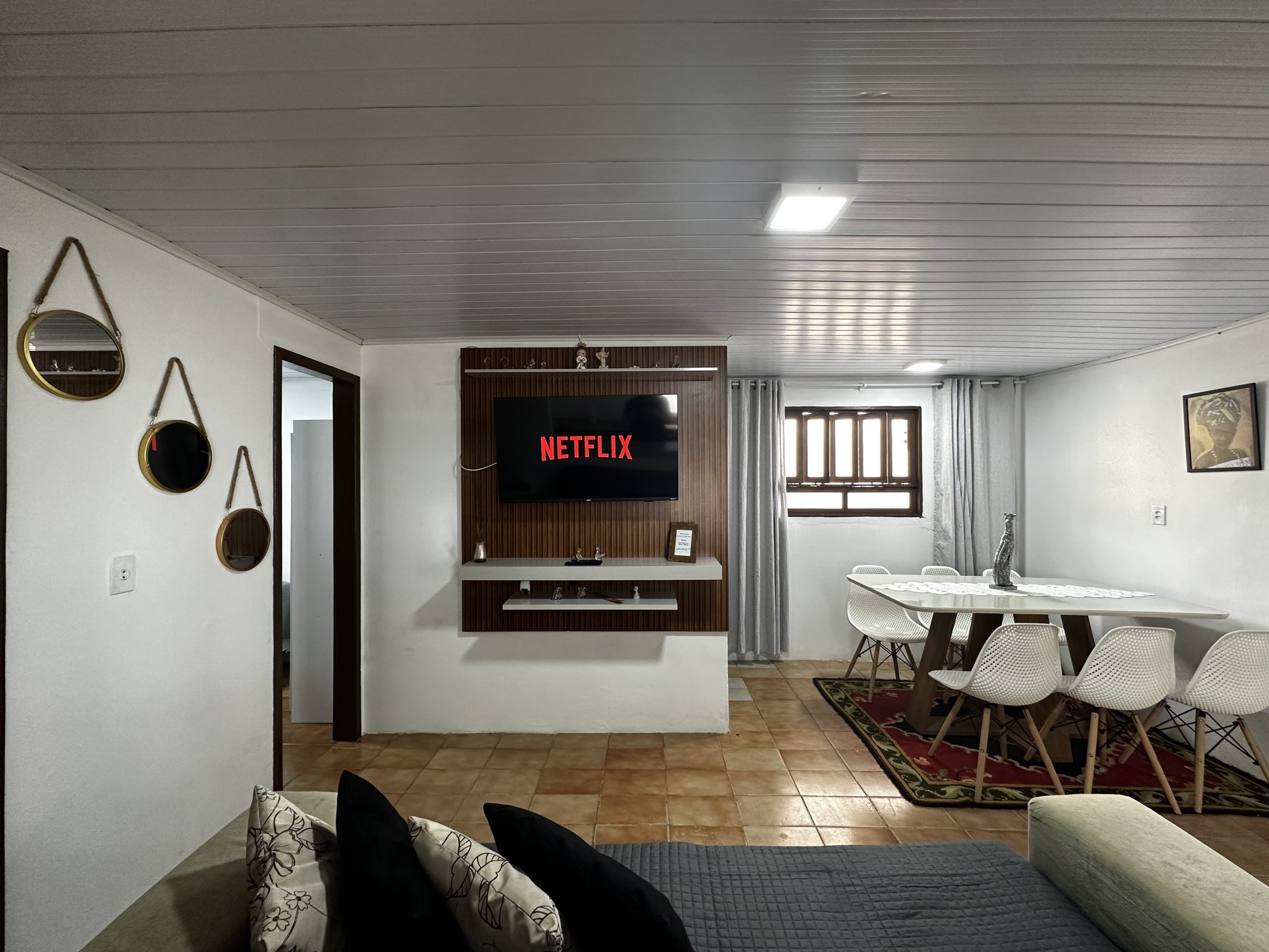 – Sala ampla e integrada com TV 32″ com aparelho BTV com canais a cabo, filme e séries