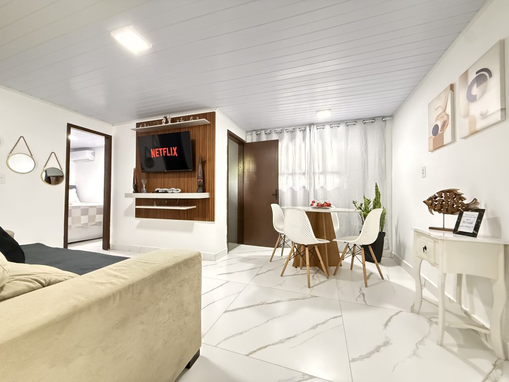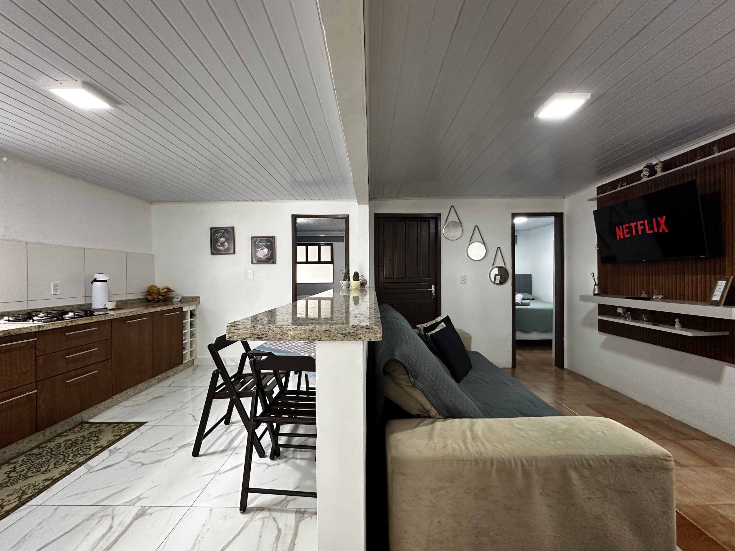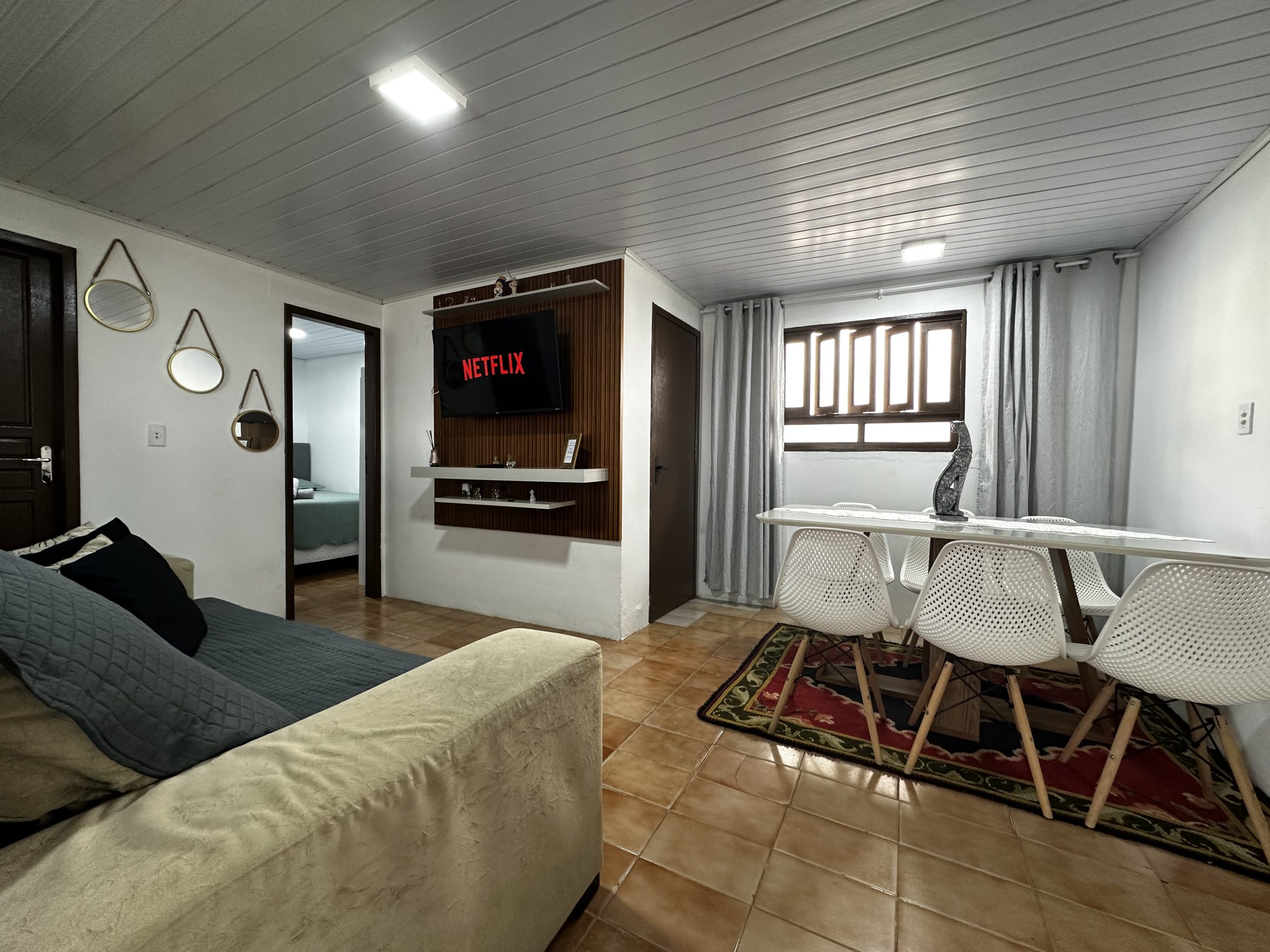 – Sala ampla e integrada com TV 32″ com aparelho BTV com canais a cabo, filme e séries
