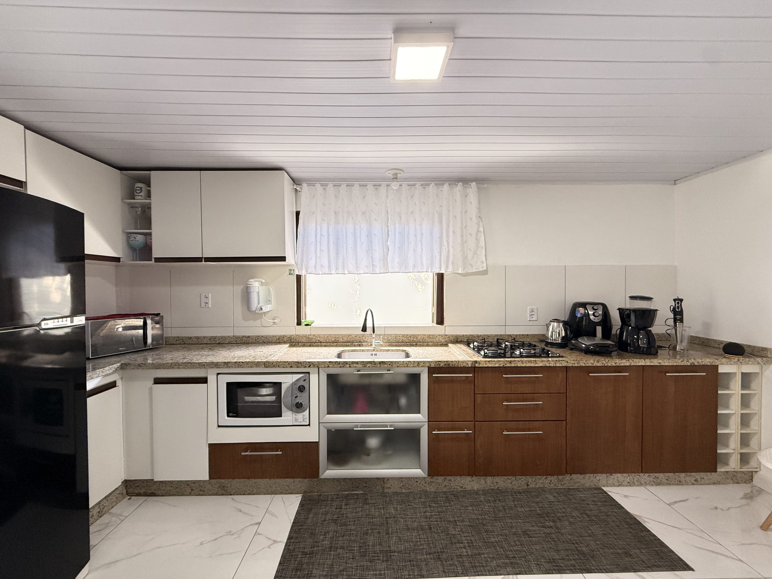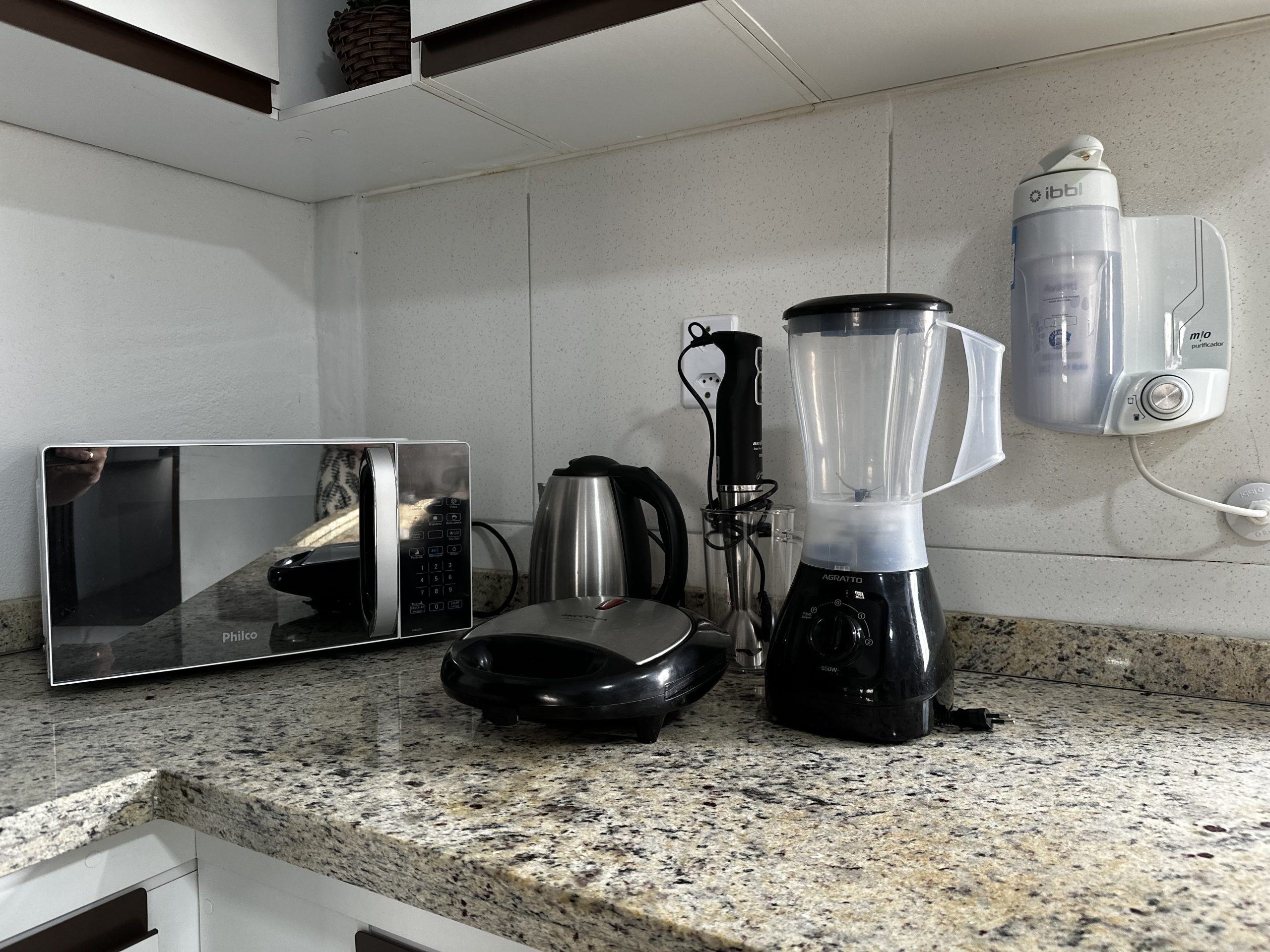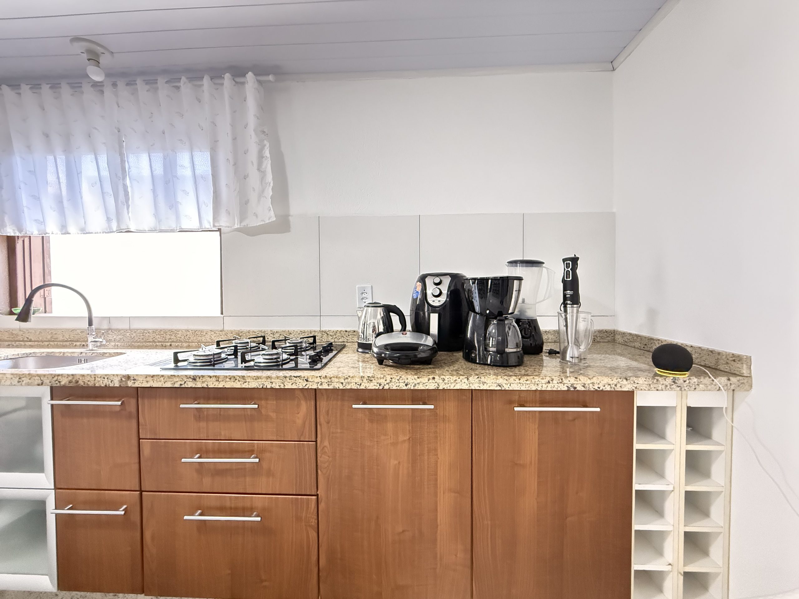 – Cozinha muito bem equipada com tudo que precisar para curtas e longas estadia, geladeira duplex, cooktop, forno elétricos, liquidificador, sanduicheira, filtro água potável, torneira elétrica, etc.