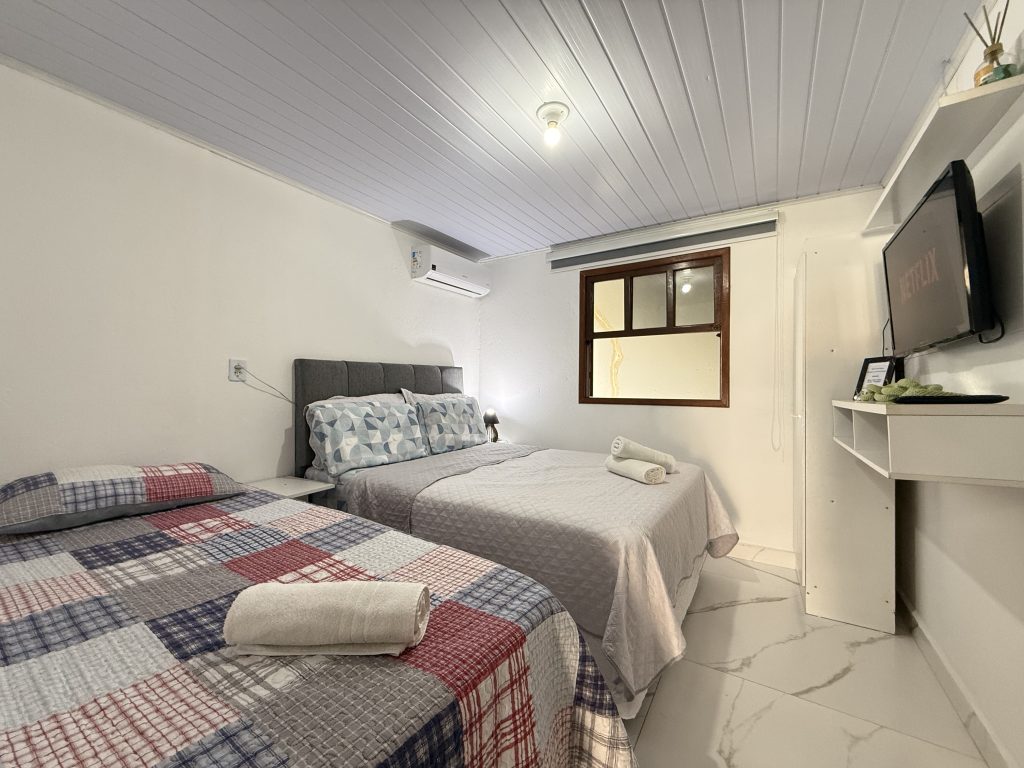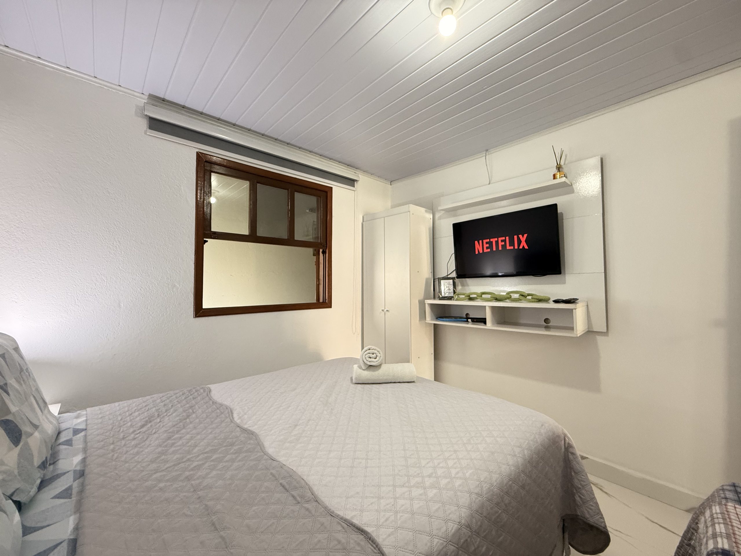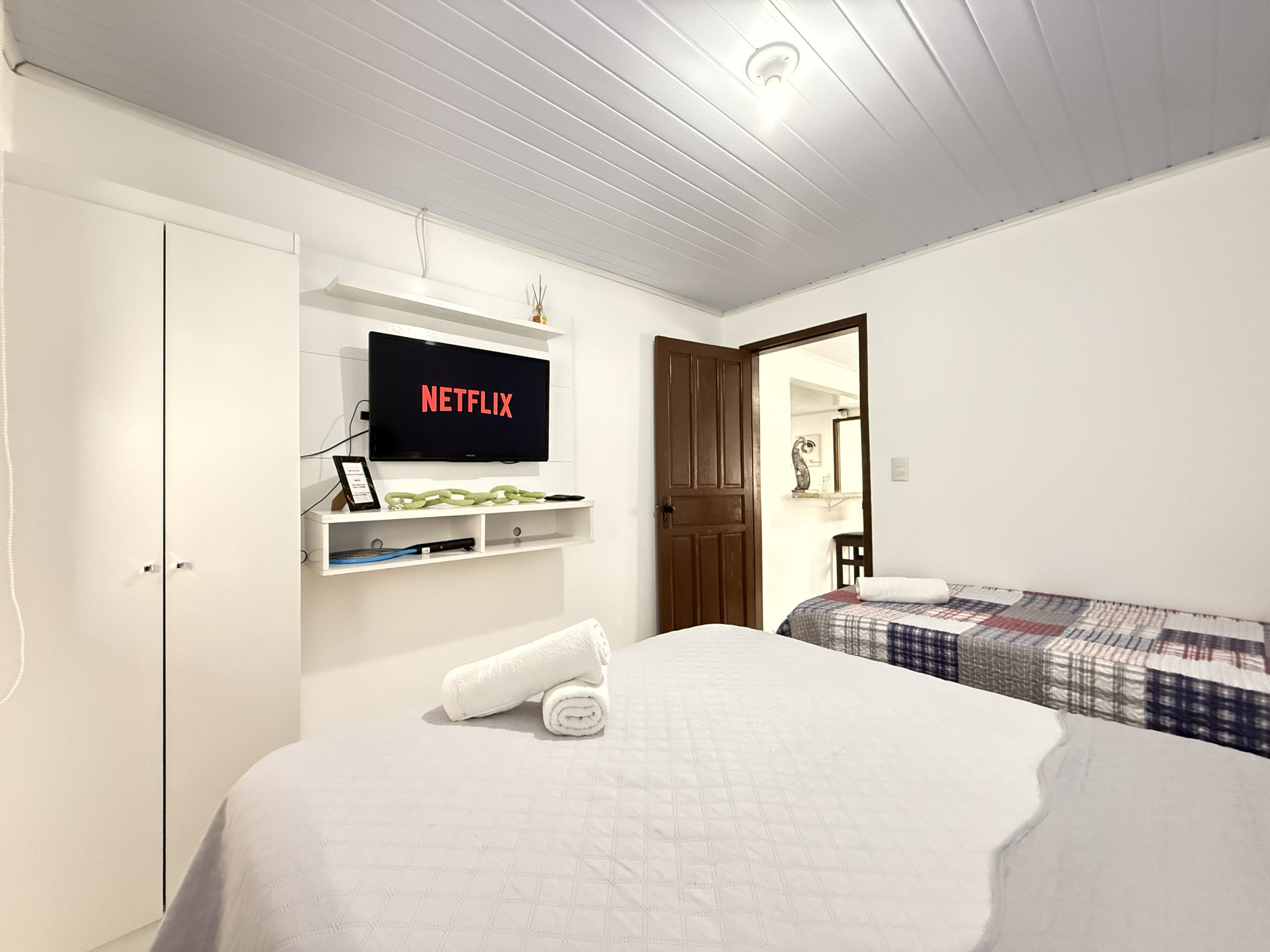 – QUARTO 3: cama casal + guarda roupas + TV com canais abertos e streaming + ar condicionado split