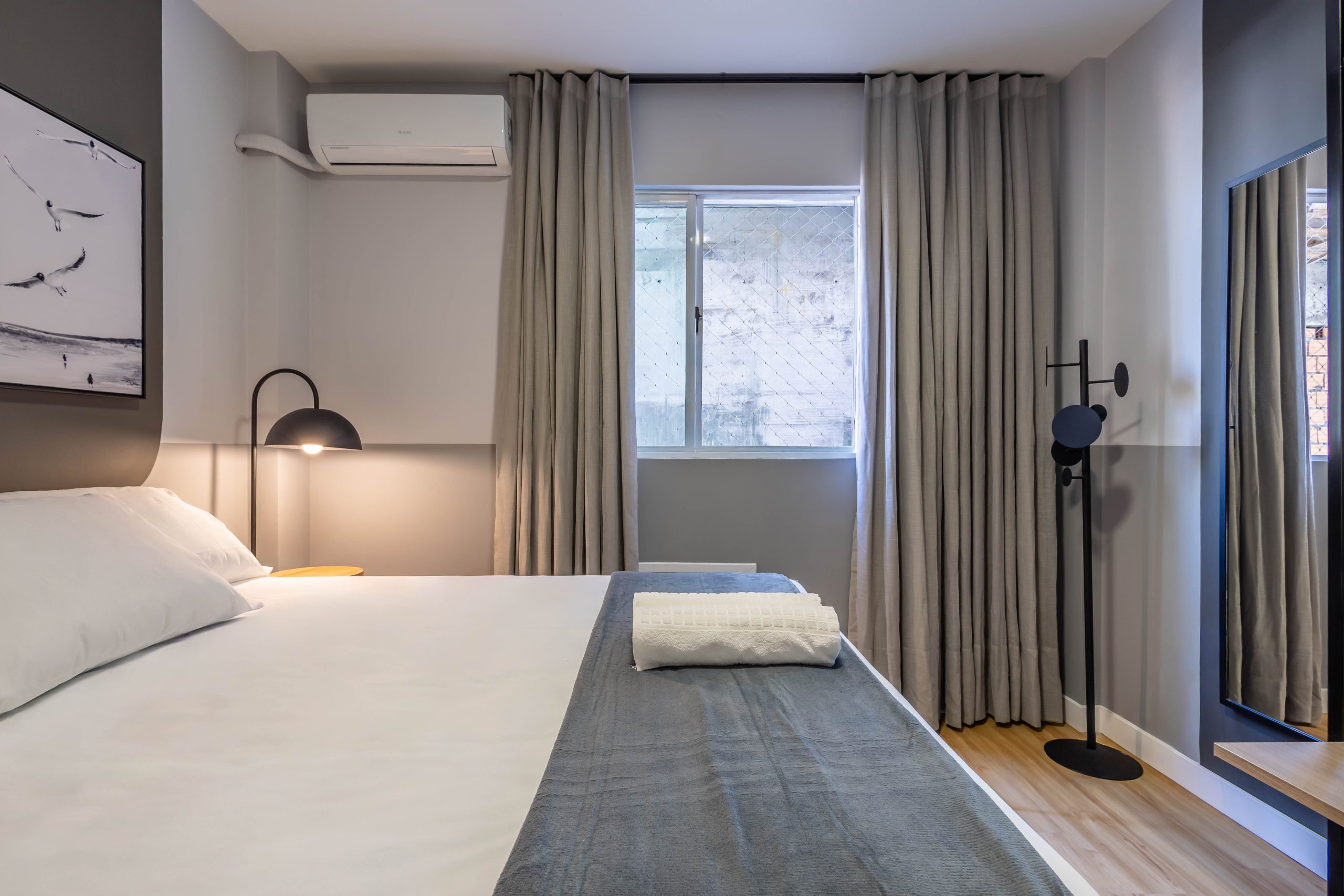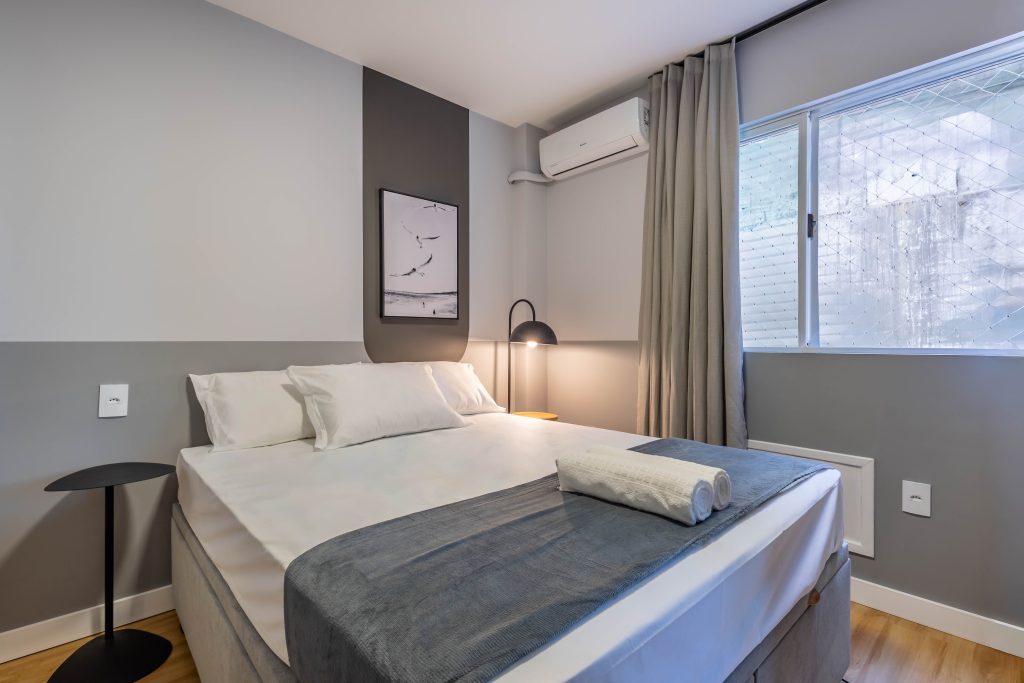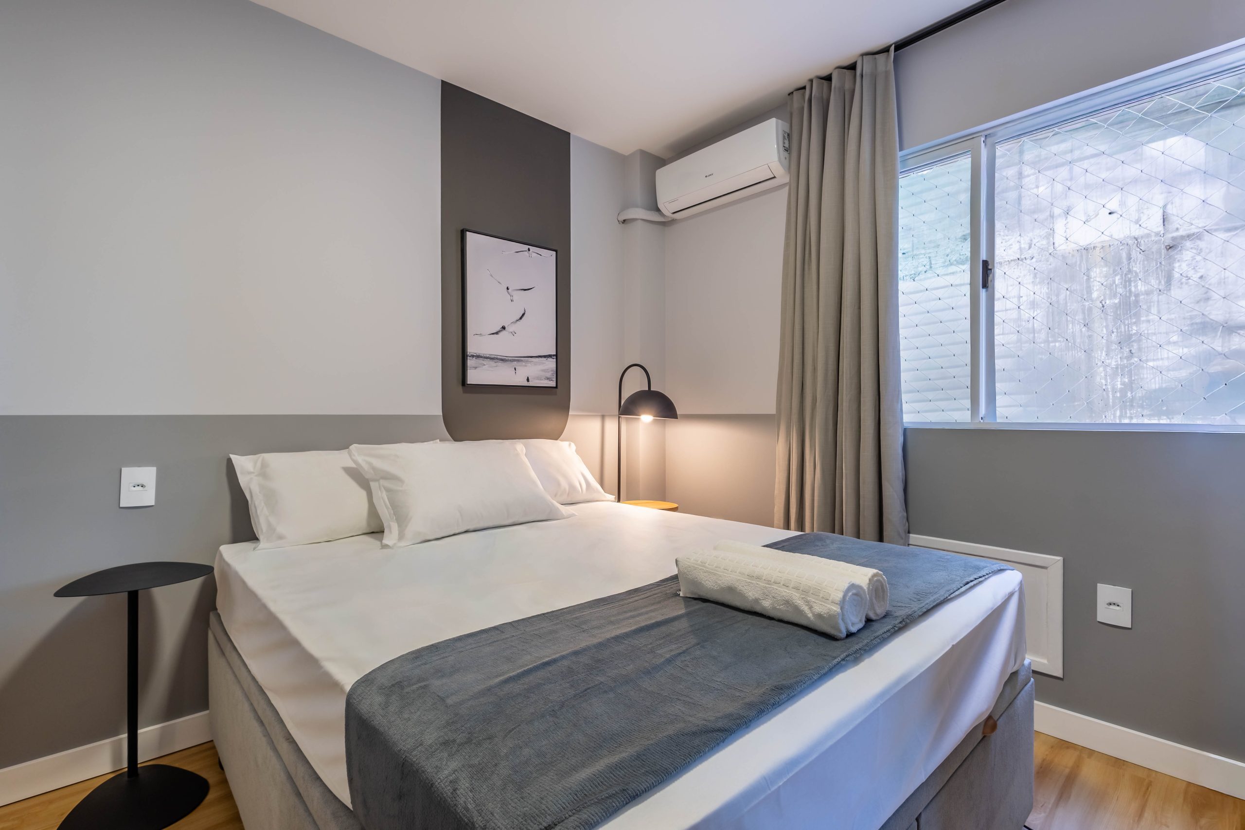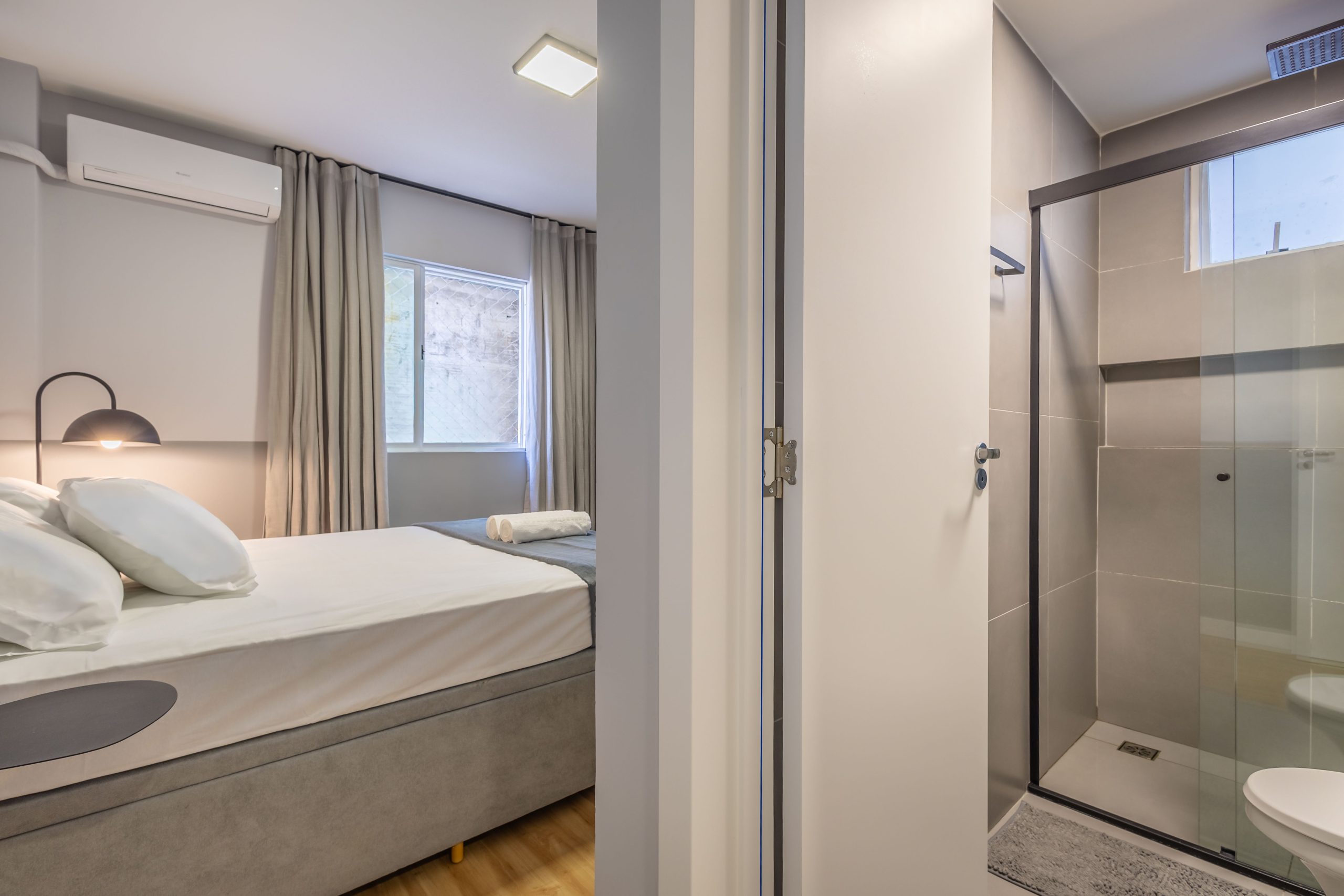 – 2 quartos climatizados (1 suíte), ambos com camas de casal novas, cortinas blackout e ar-condicionado split.
