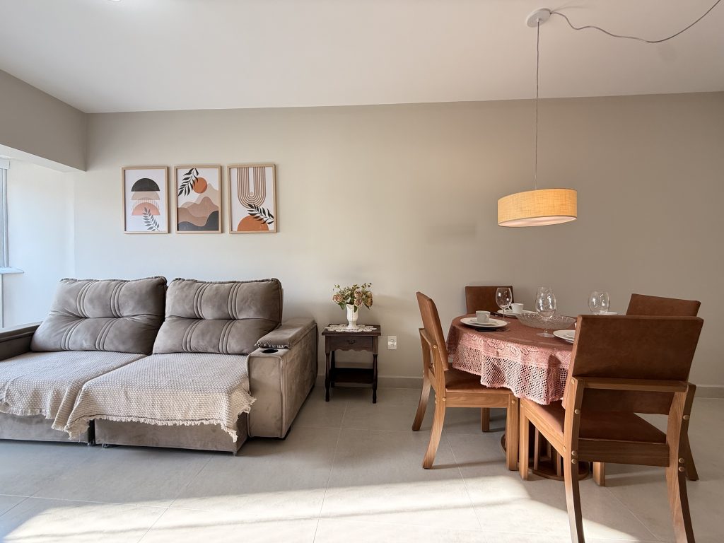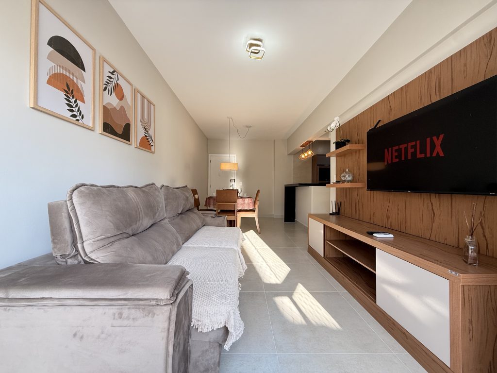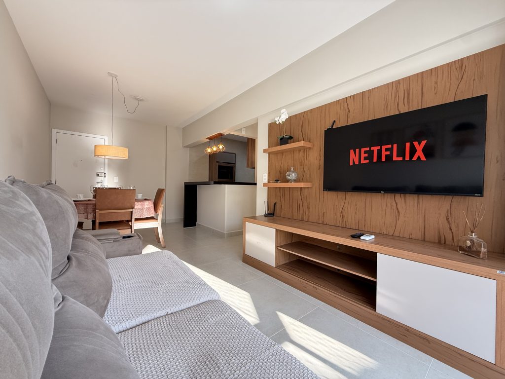 – Sala com sofá grande novo super confortável + TV Smart 47″ polegadas com app como Netflix, Globoplay, Amazon Prime (necessário conectar com a conta própria)