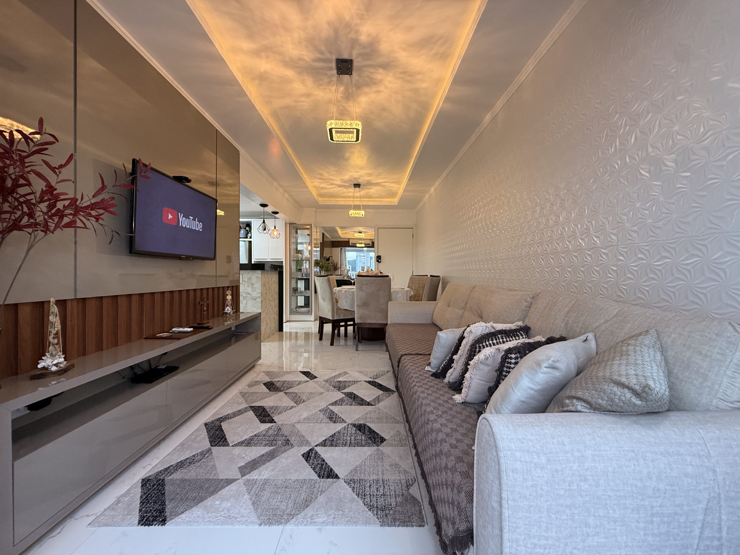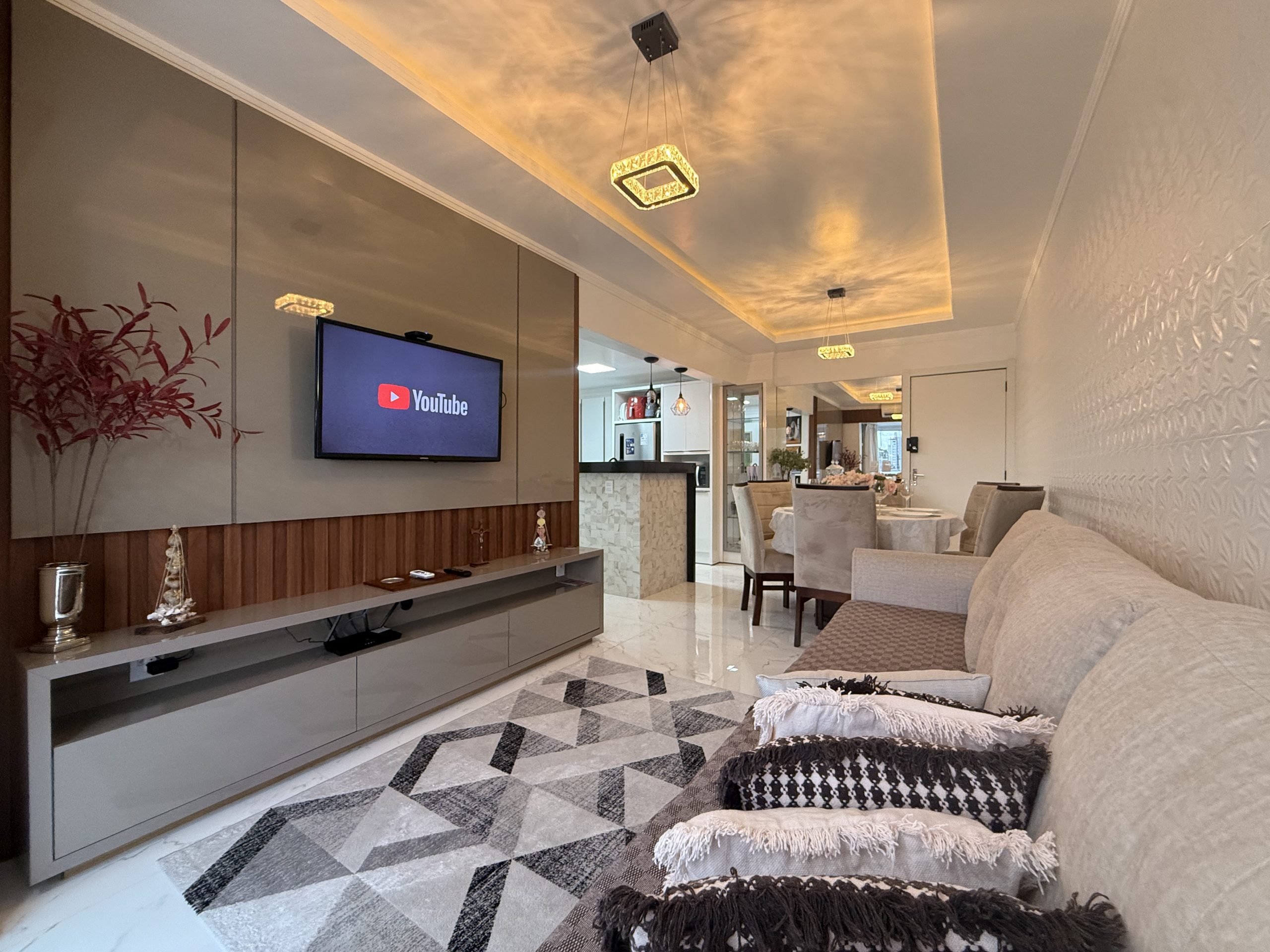 • Sala de estar com Smart TV, ótima para relaxar após um dia de praia.