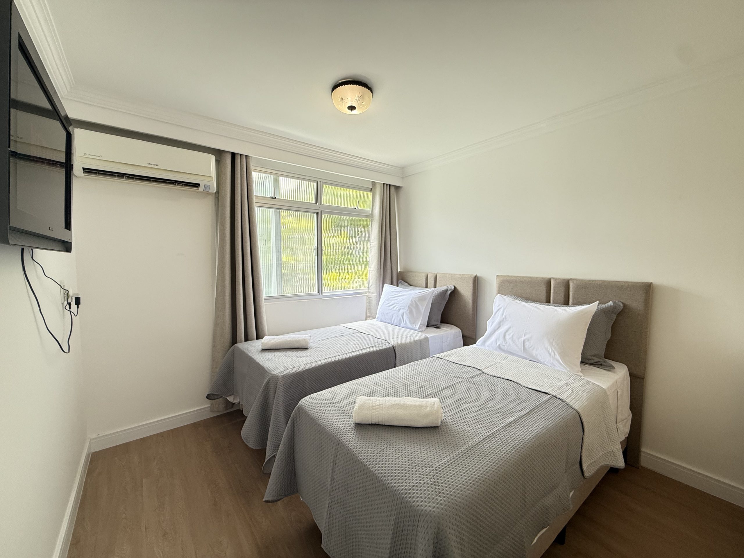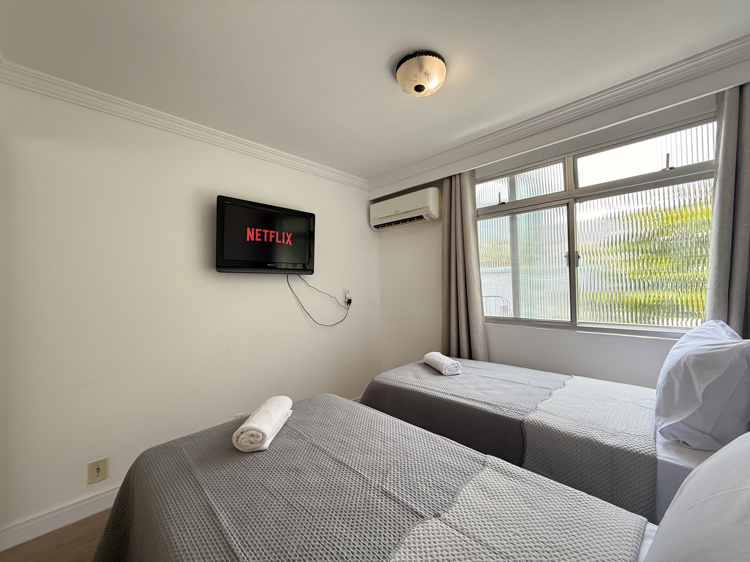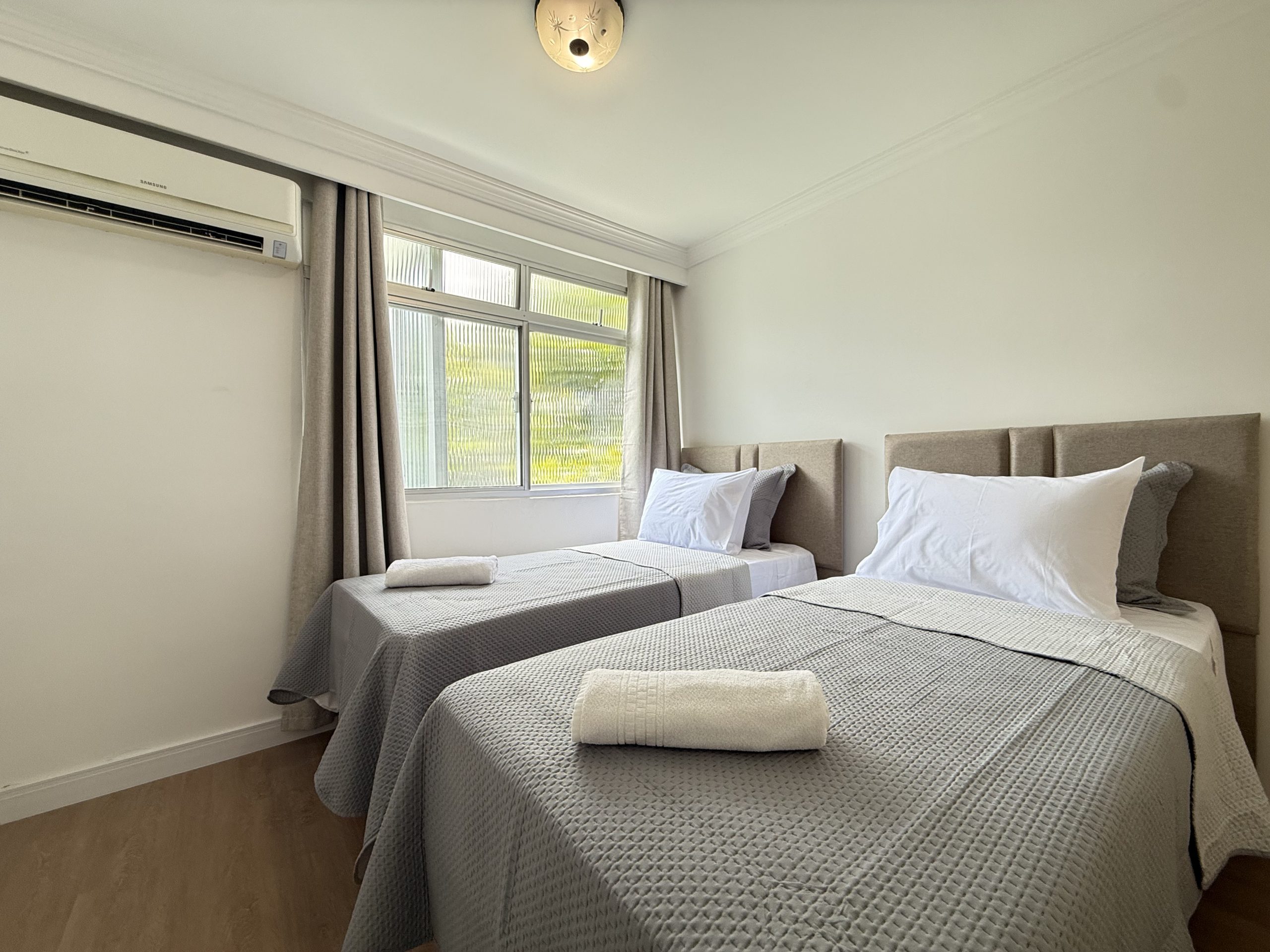 – 2 quartos climatizados (1 suíte): A suíte conta com cama Queen Size nova. O segundo quarto possui duas camas de solteiro novas, com a opção de montagem como Cama King Size (necessário solicitar com antecedência). Ambos com ar-condicionado.