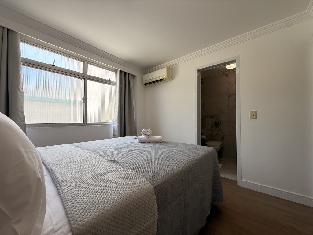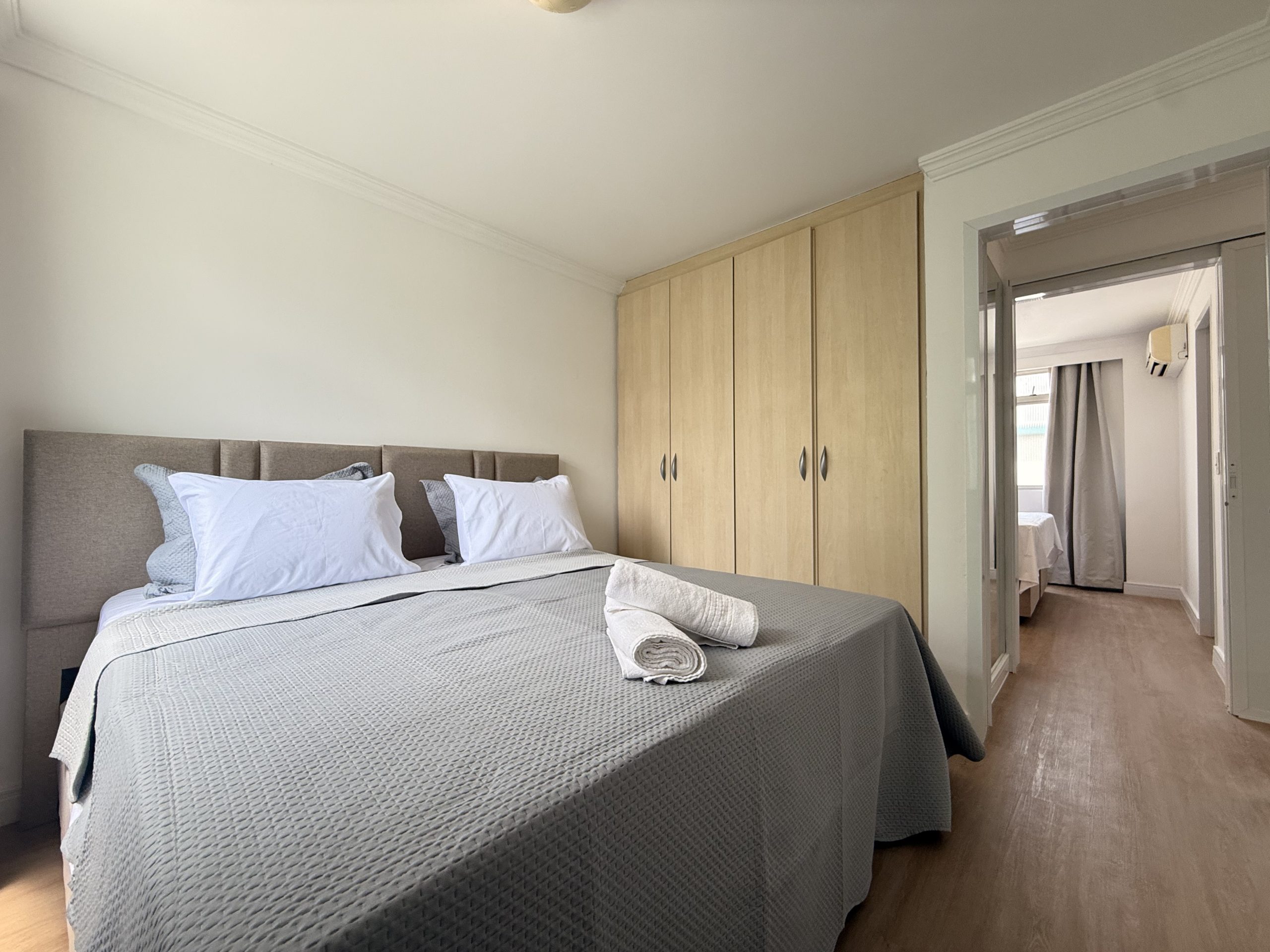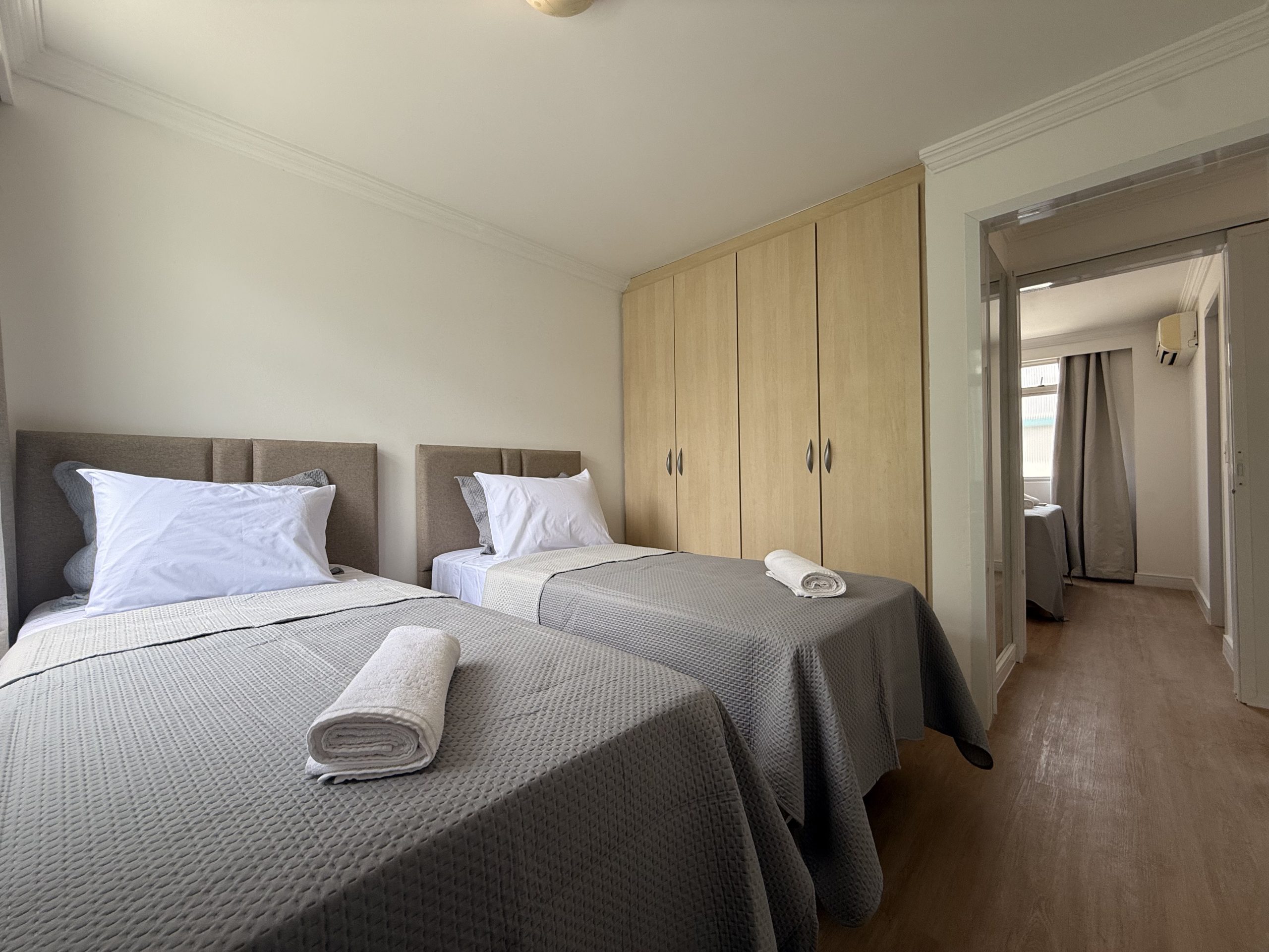 – 2 quartos climatizados (1 suíte): A suíte conta com cama Queen Size nova. O segundo quarto possui duas camas de solteiro novas, com a opção de montagem como Cama King Size (necessário solicitar com antecedência). Ambos com ar-condicionado.