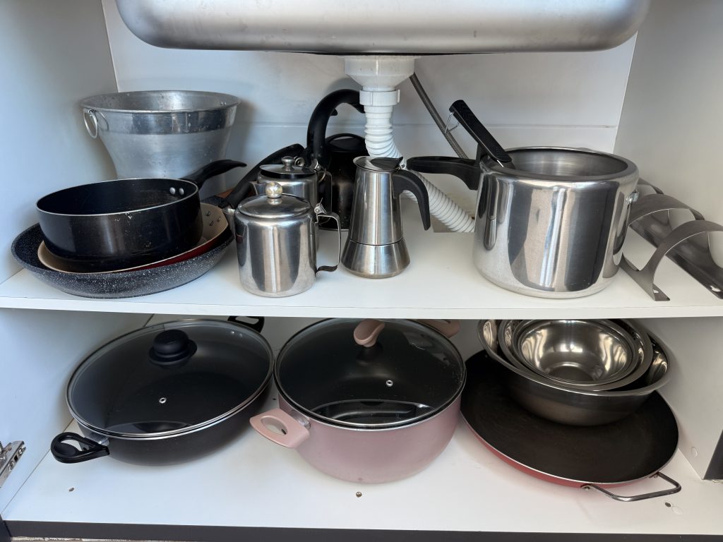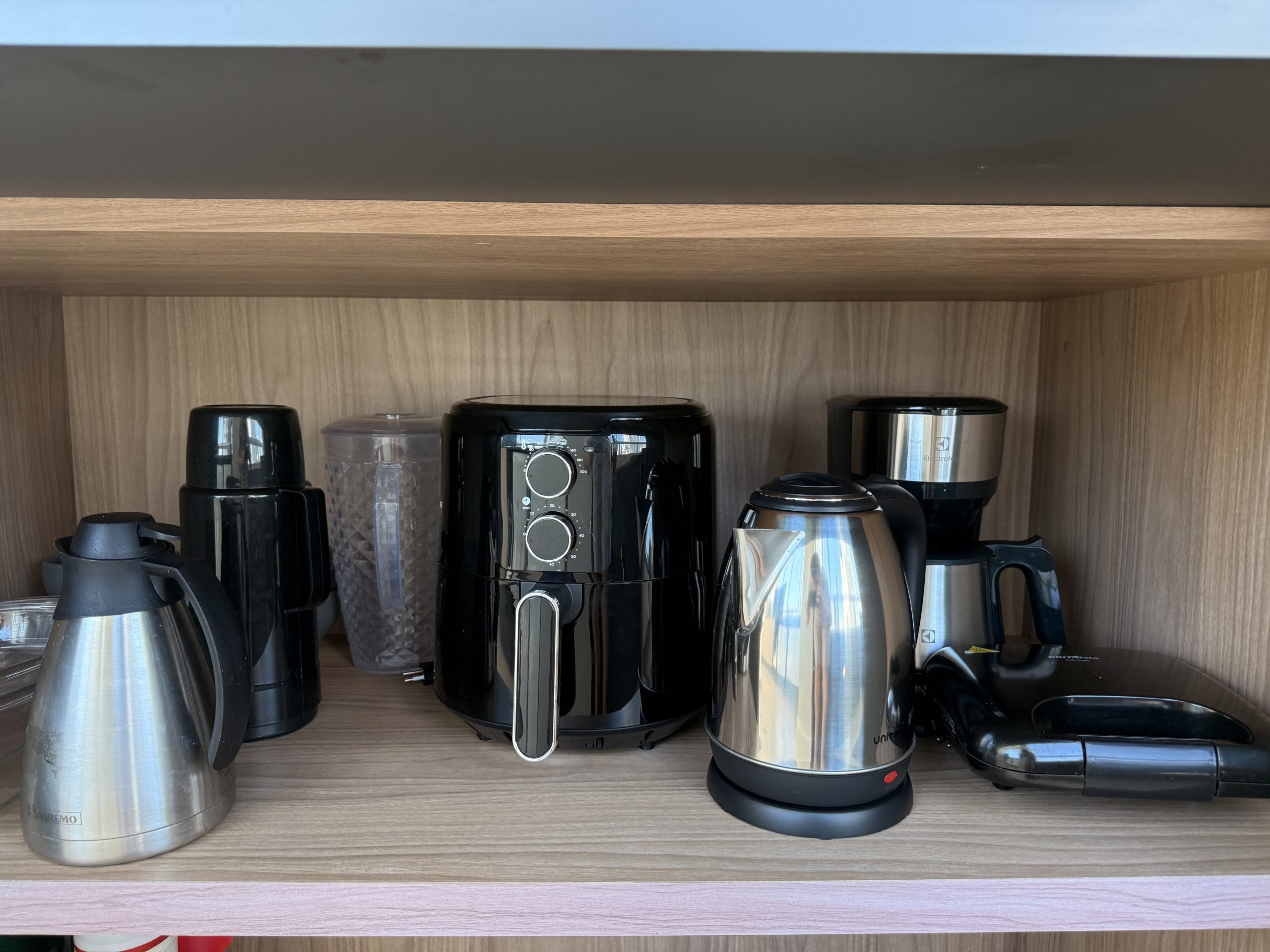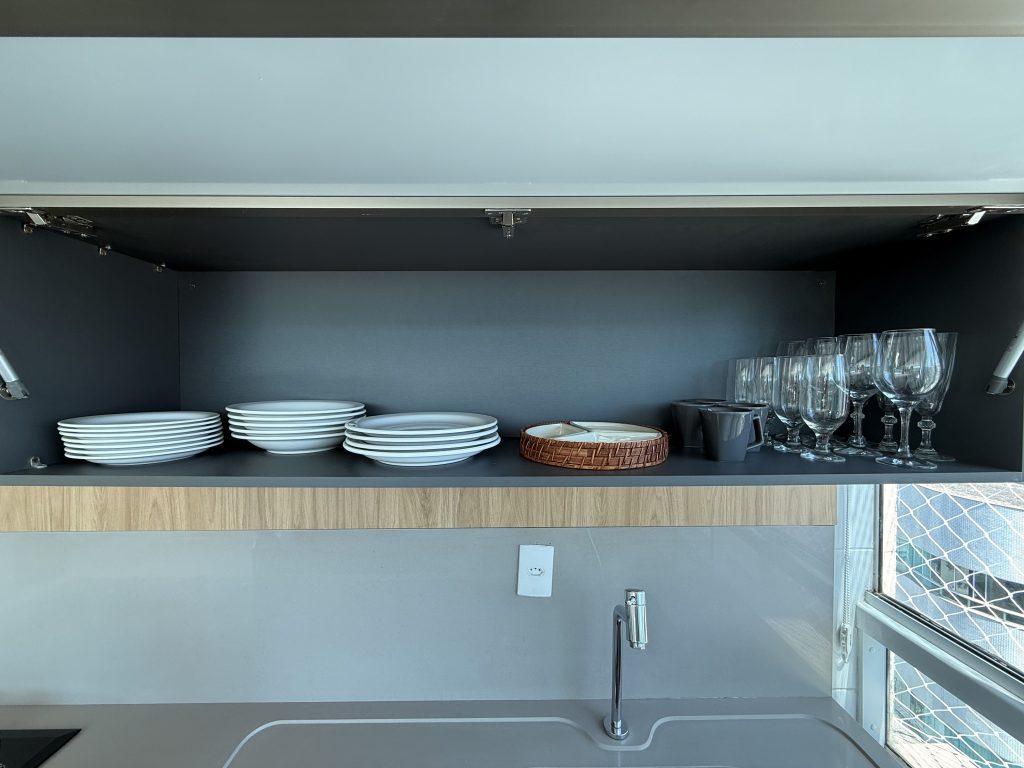 – Cozinha muito bem equipada com tudo que precisa para curtas e longas estadia, são dois frigobar, microondas, cooktop, forno elétrico, cafeteira elétrica, airfryer, sanduicheira, talheres variados e louças diversas.