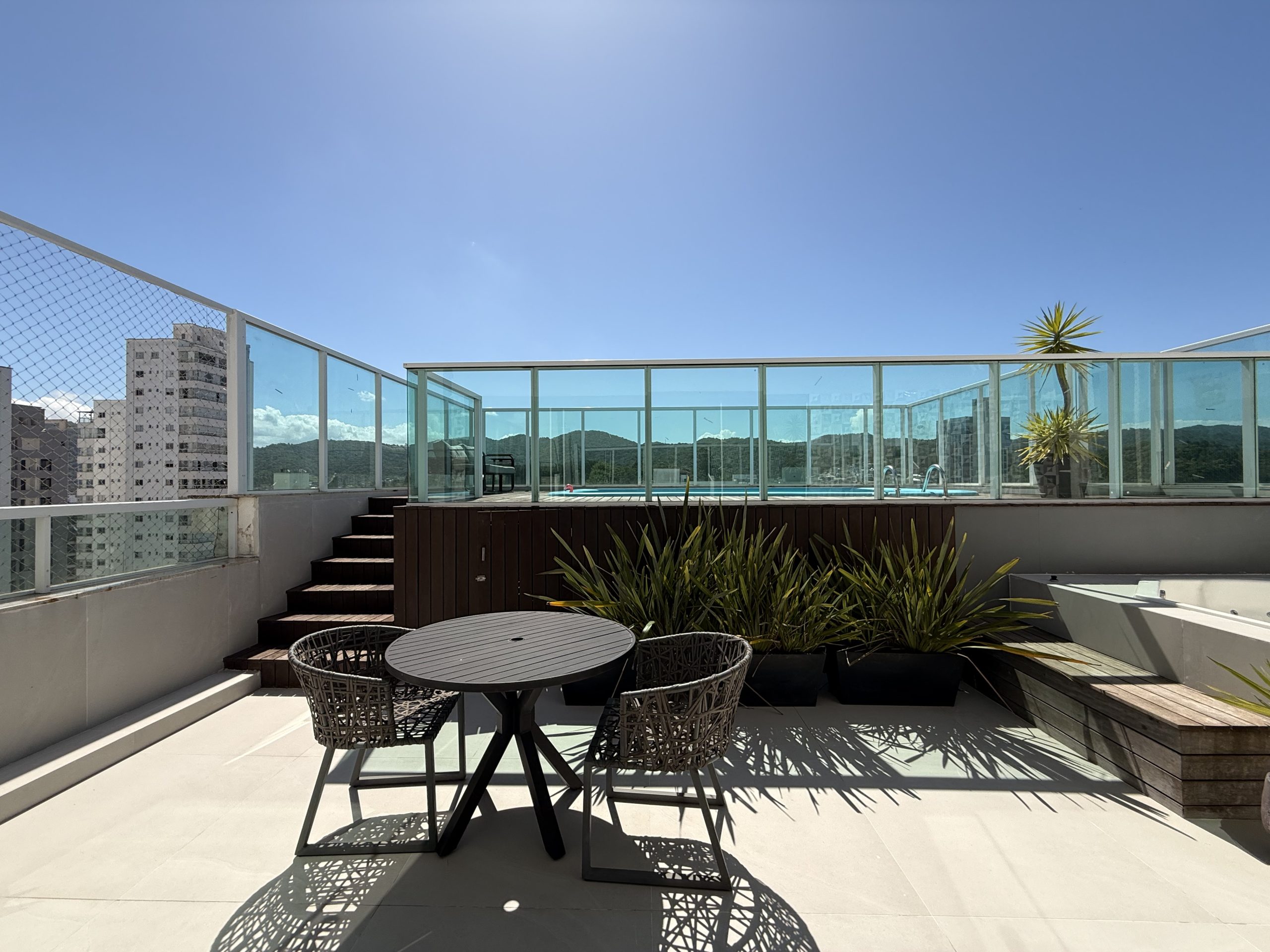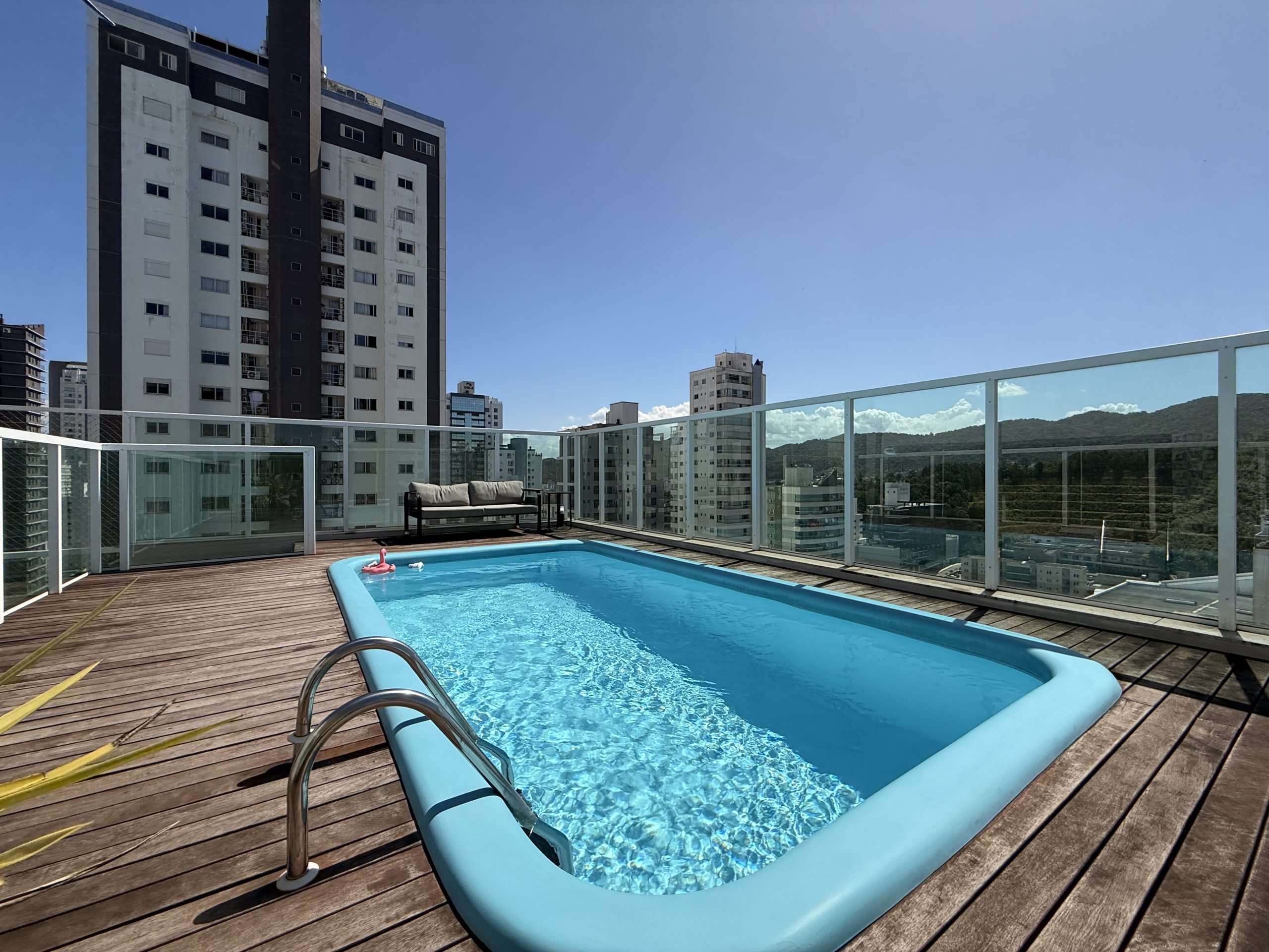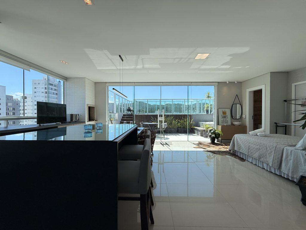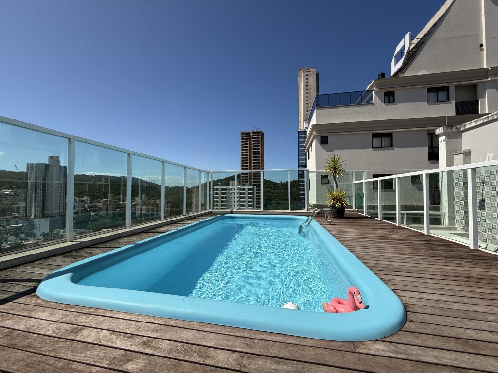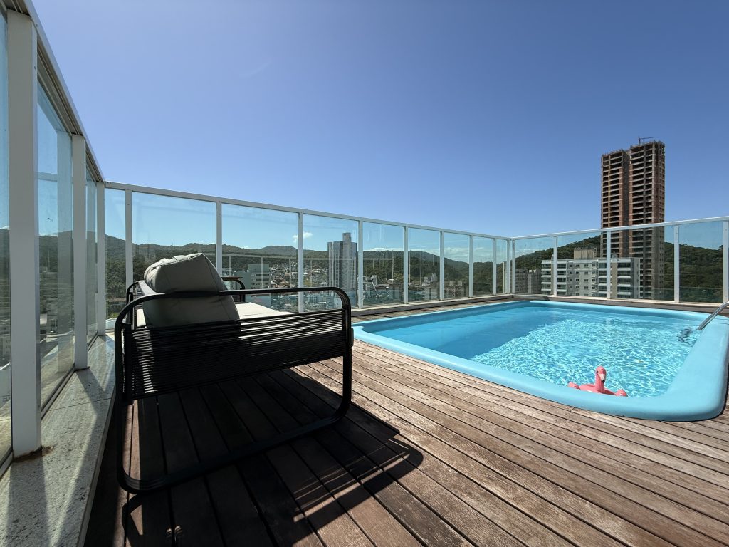 Maravilhoso Studio com piscina e Jacuzzi privativa, churrasqueira à carvão em cobertura prédio na barra norte da cidade, onde poderá desfrutar de um por do sol incrível e também de uma vista mar. Studio muito bem equipado para uma excelente estadia, cozinha completa, fornecemos roupas de cama e banho, acomoda até 4 hóspedes. Ar condicionado 24 mil BTU climatizando todo o ambiente, TV Smart 50″ polegadas com canais à cabo e internet 300MB, ideal para Home Office, são 2 vagas de garagem.