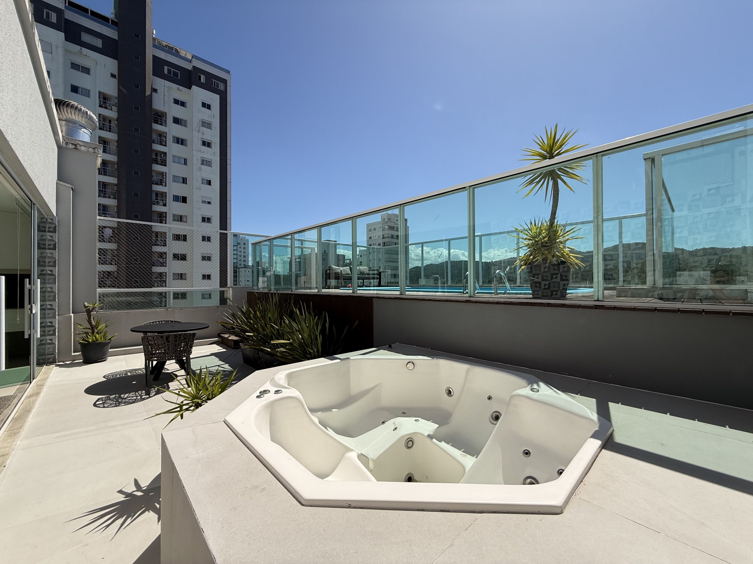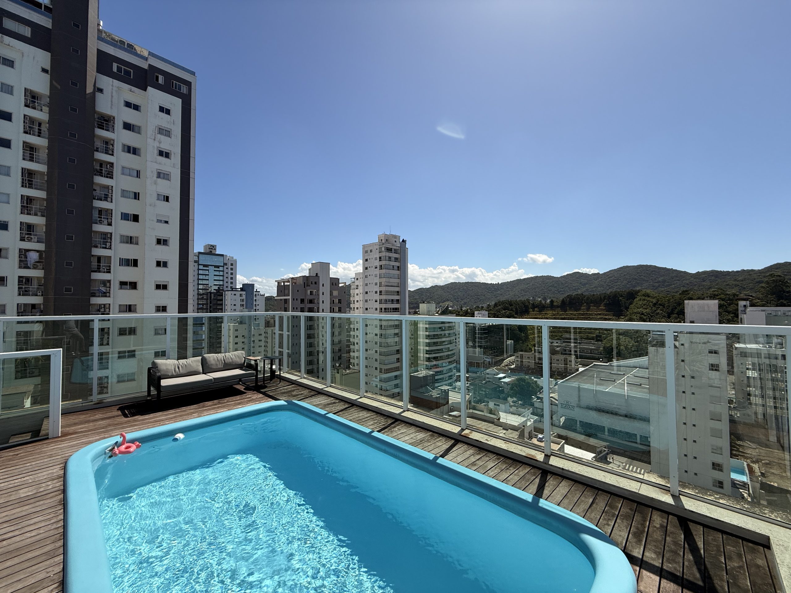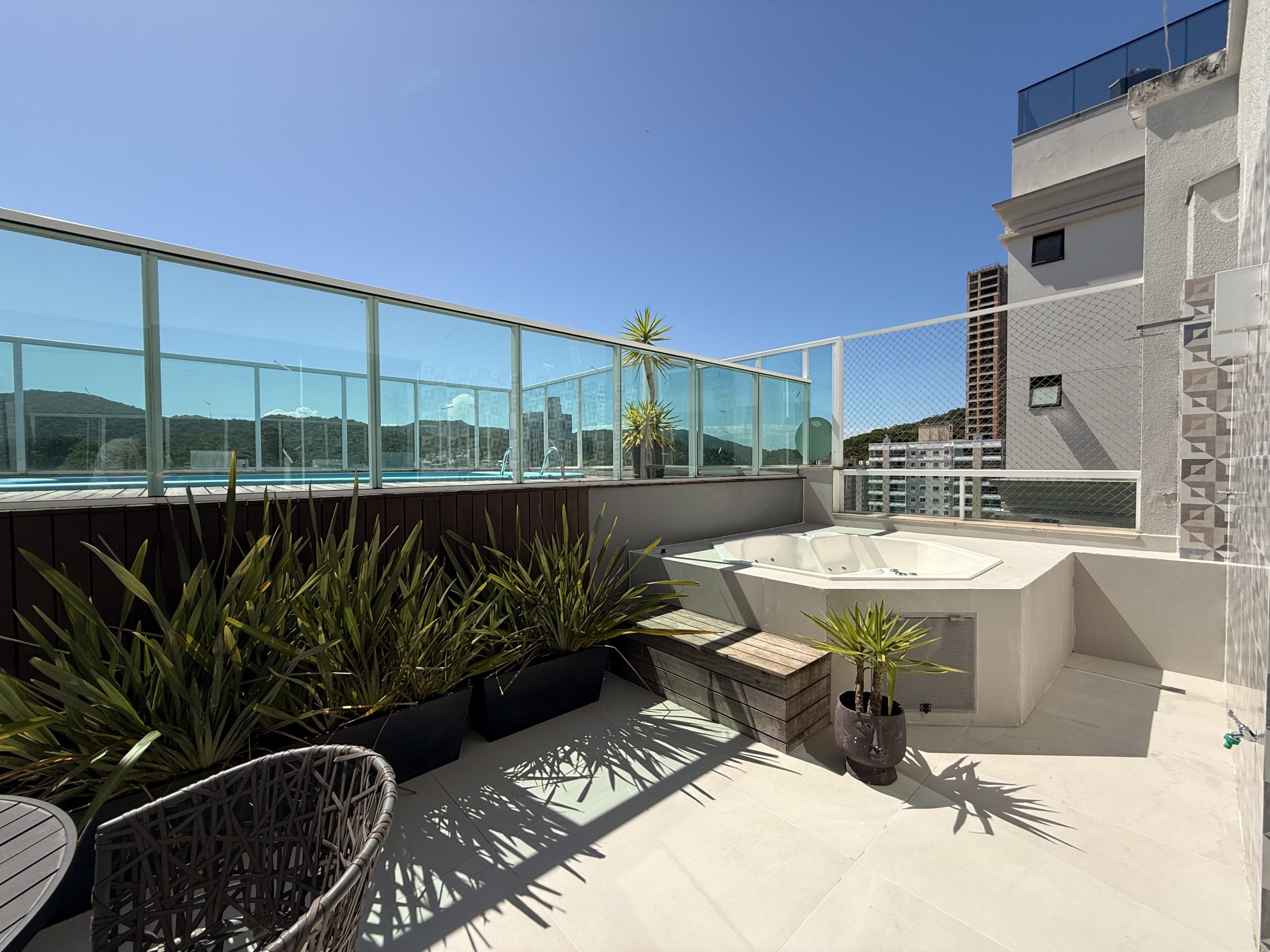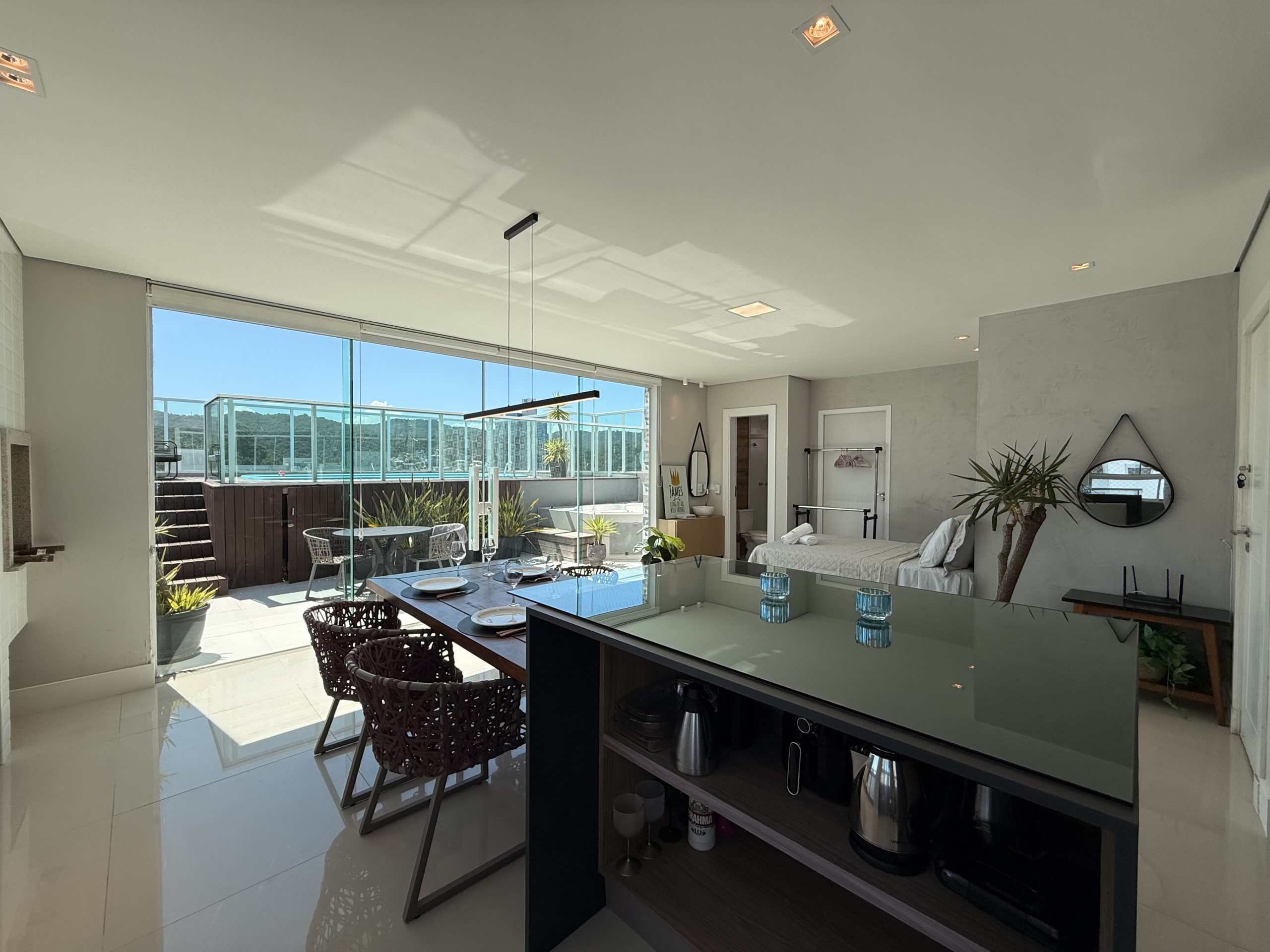 Maravilhoso Studio com piscina e Jacuzzi privativa, churrasqueira à carvão em cobertura prédio na barra norte da cidade, onde poderá desfrutar de um por do sol incrível e também de uma vista mar. Studio muito bem equipado para uma excelente estadia, cozinha completa, fornecemos roupas de cama e banho, acomoda até 4 hóspedes. Ar condicionado 24 mil BTU climatizando todo o ambiente, TV Smart 50″ polegadas com canais à cabo e internet 300MB, ideal para Home Office, são 2 vagas de garagem.