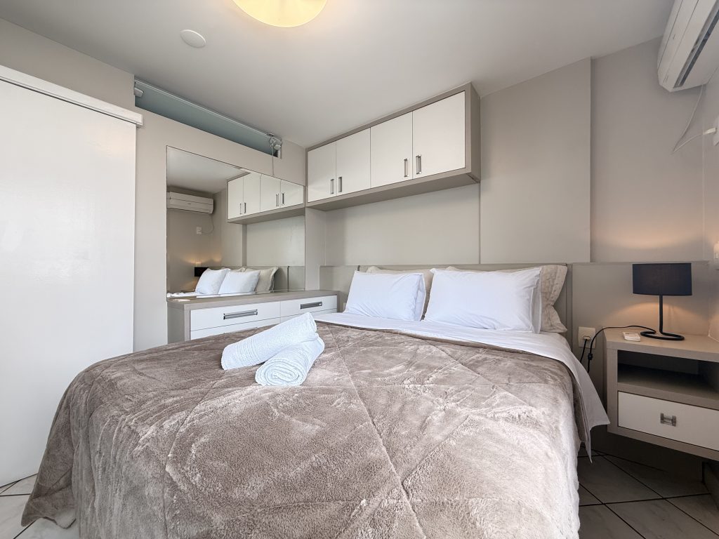 – 1 quarto com cama queen size e ar-condicionado.