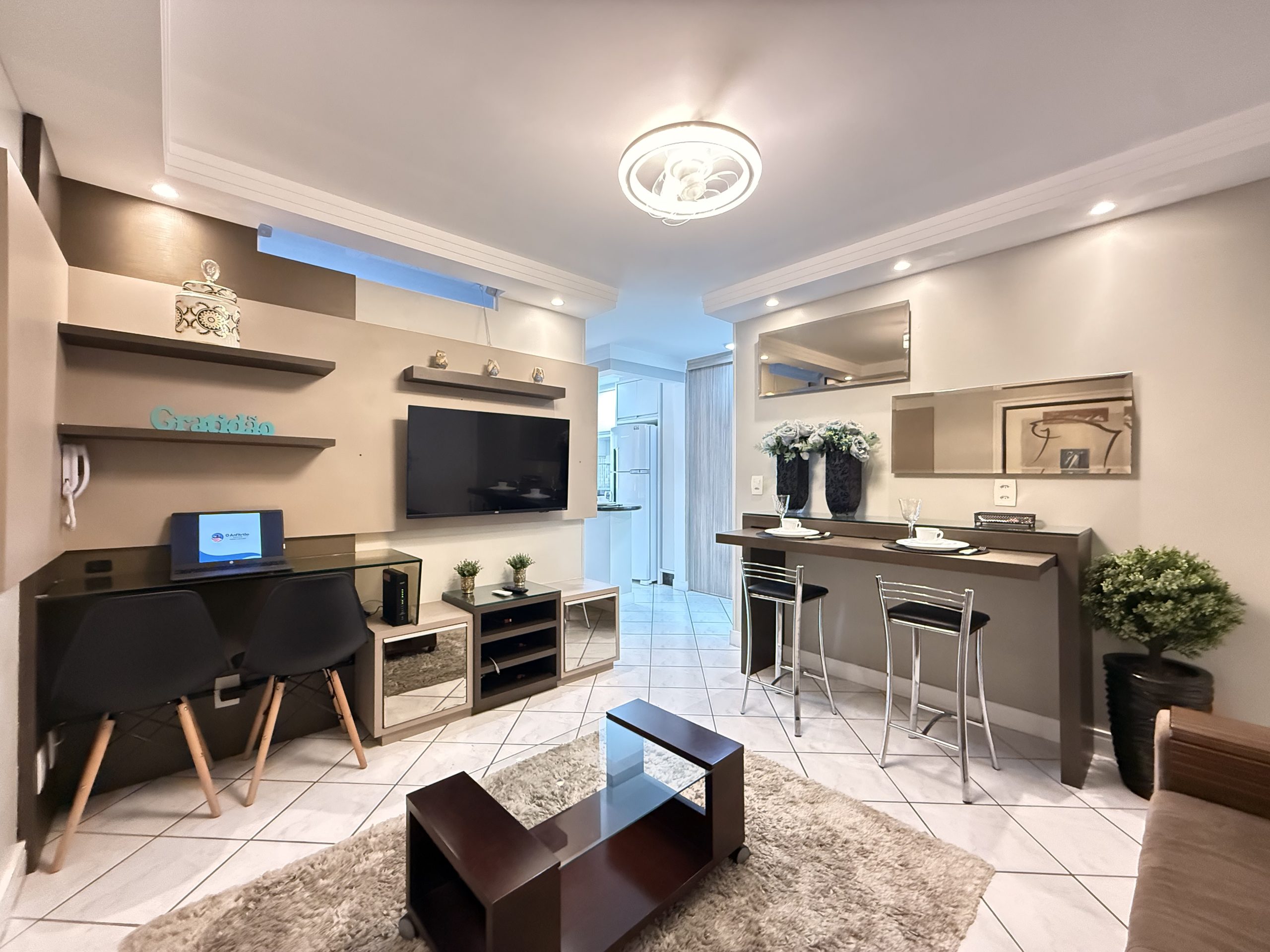 Sala de estar: Sofá confortável, TV Smart e ventilador de teto.