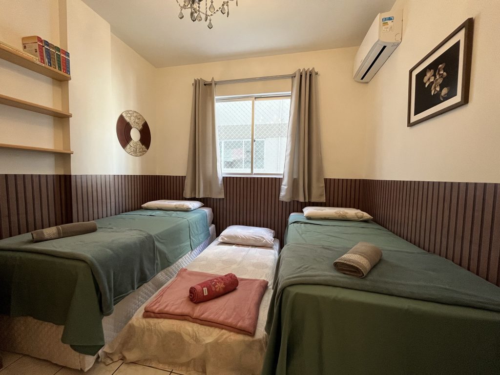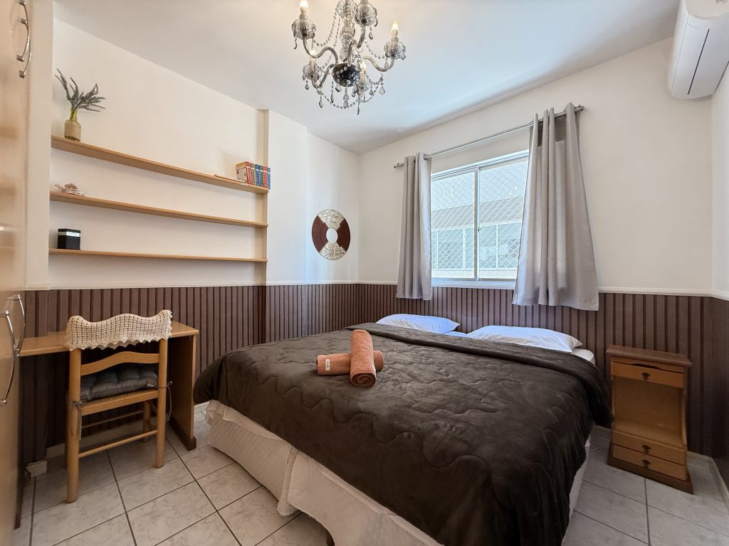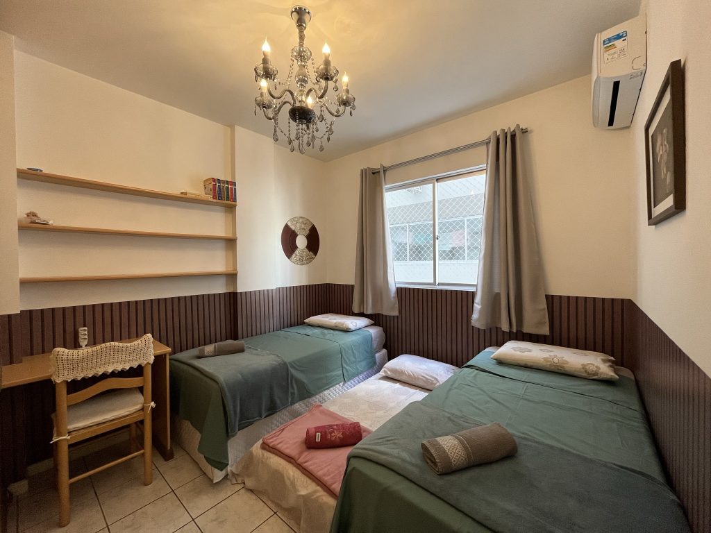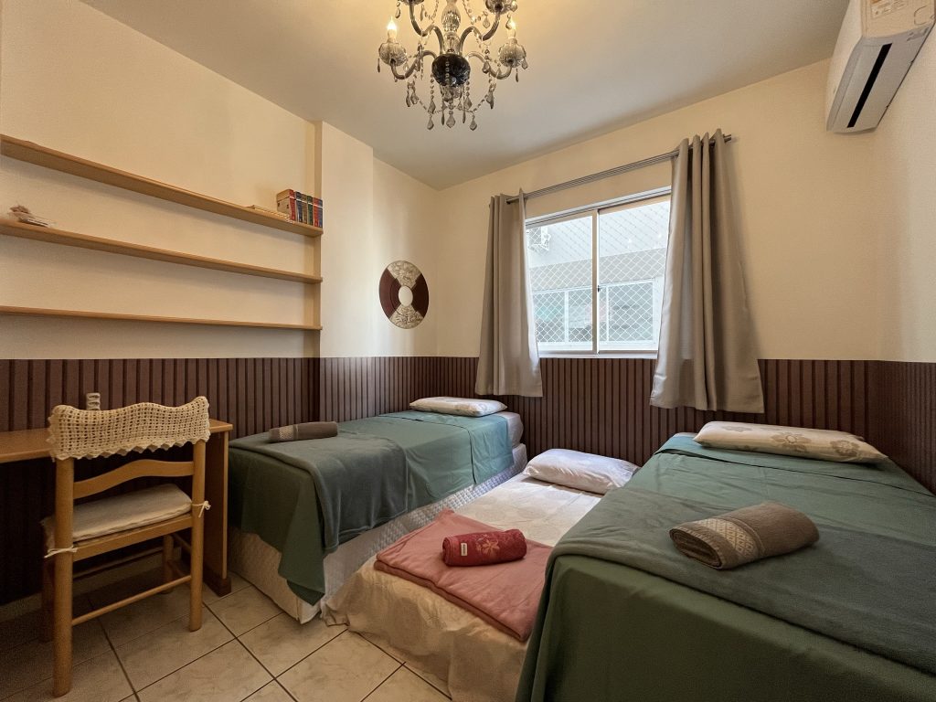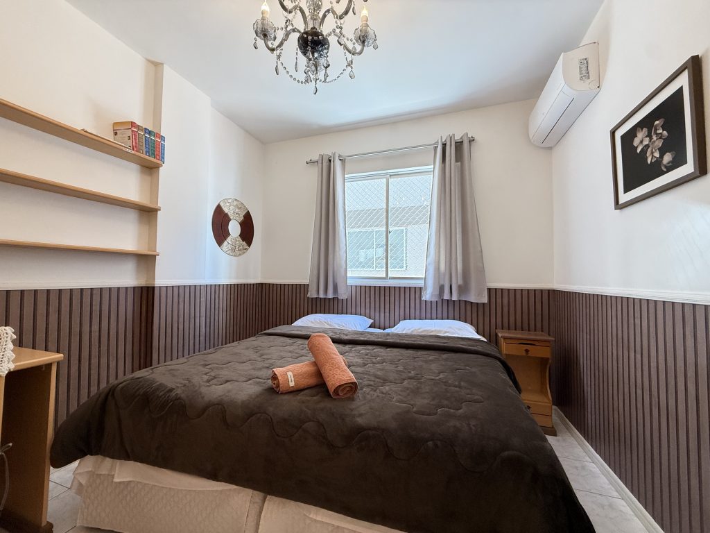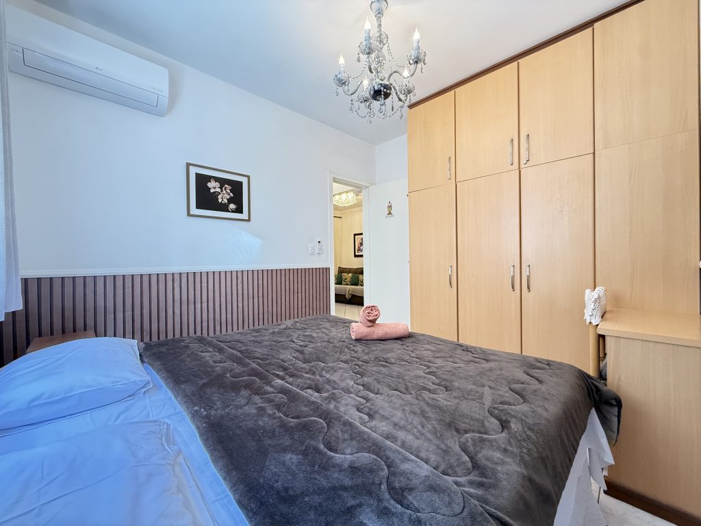 – QUARTO 1: Suíte com cama de casal, ar condicionado split novo, armário e acesso a sacada. (tem espaço para um colchão de solteiro no chão)