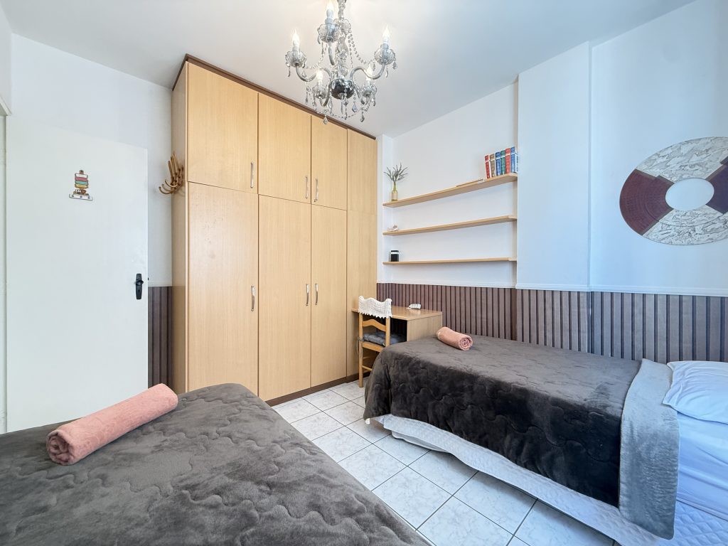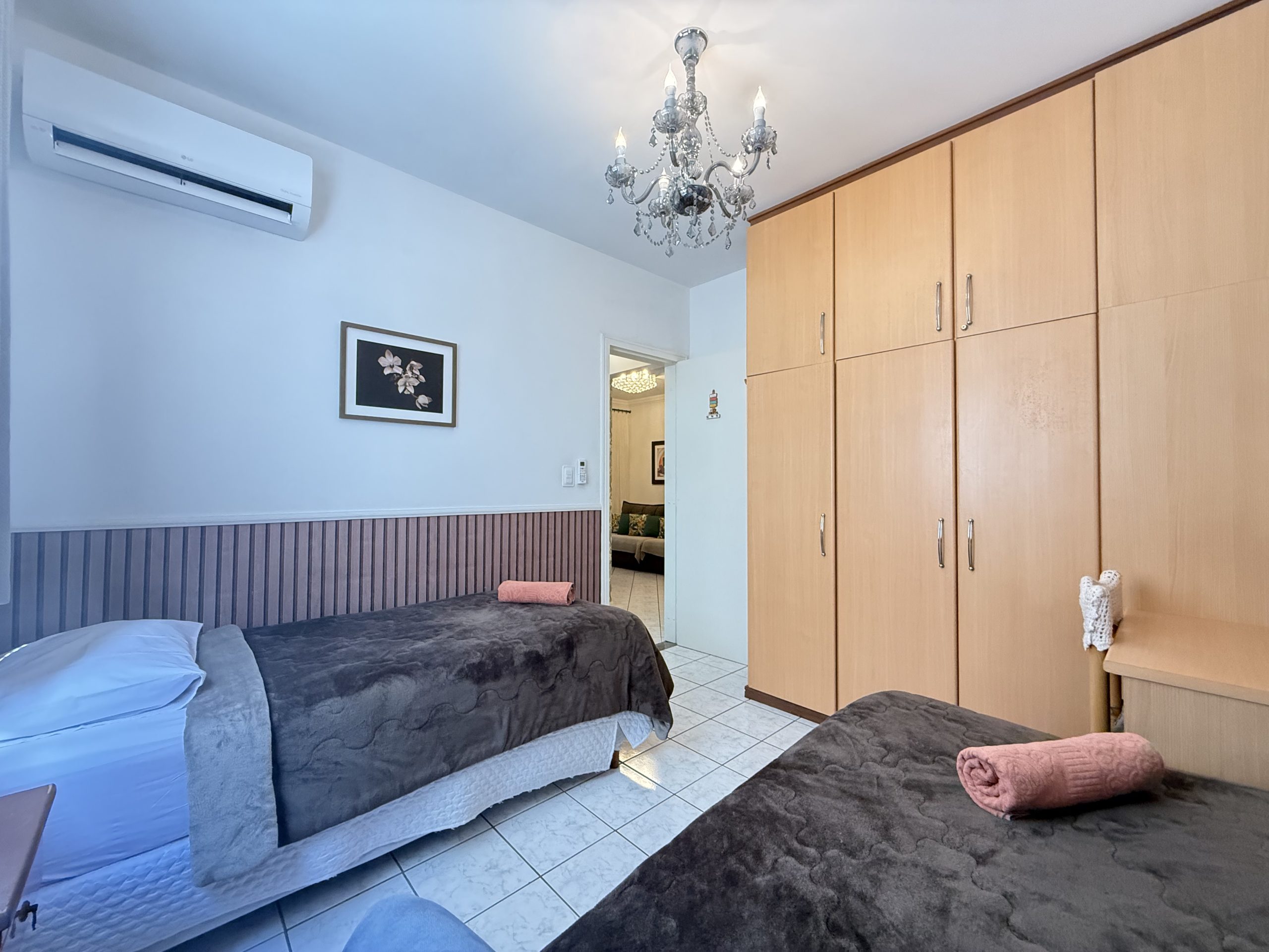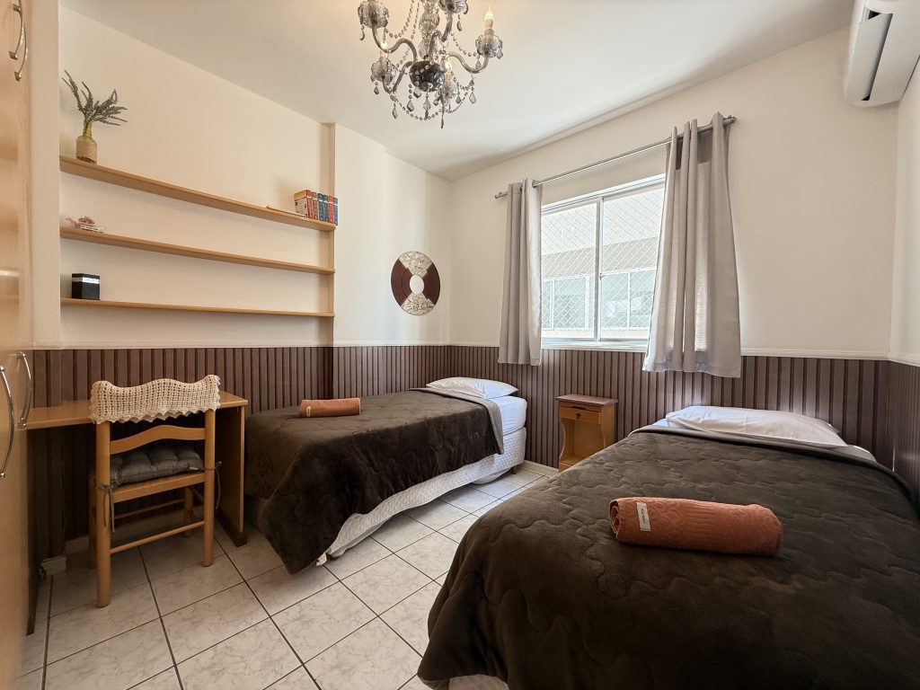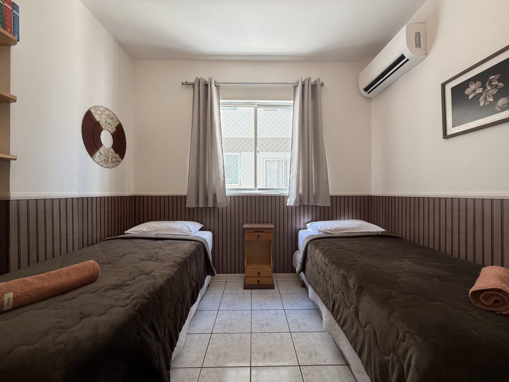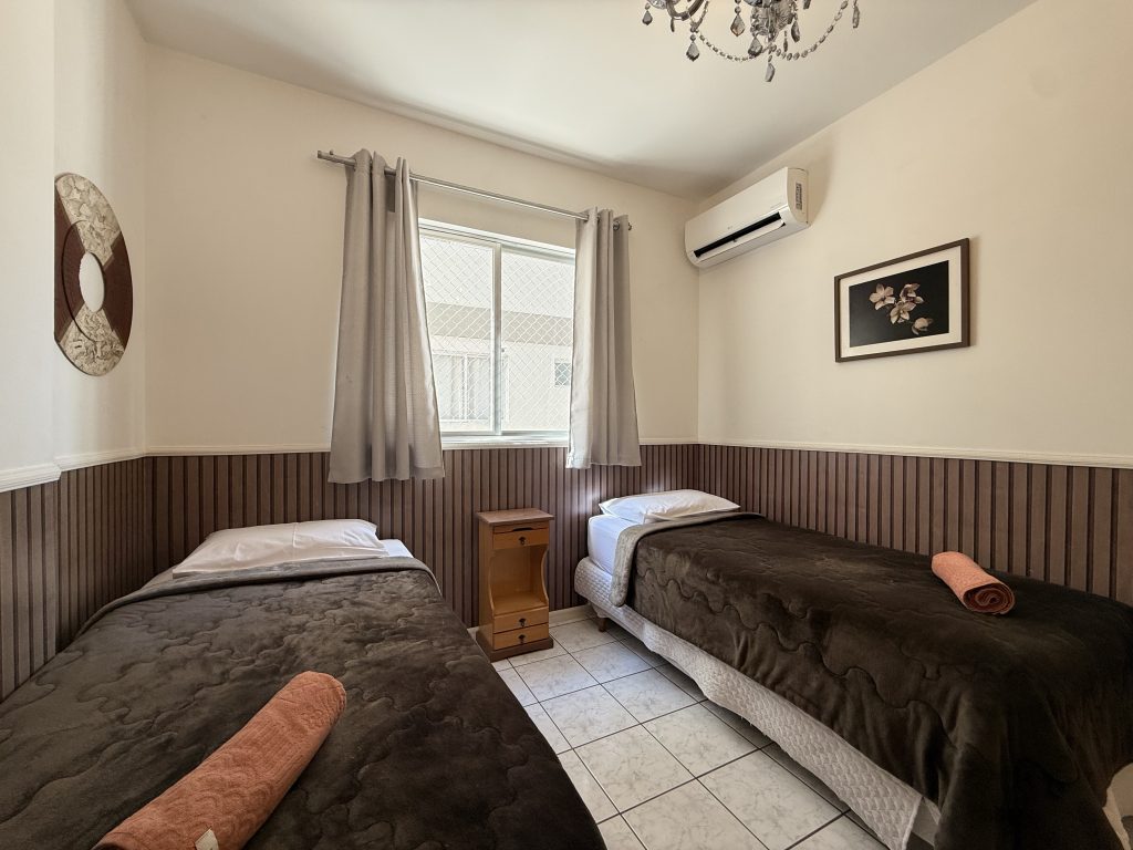 – QUARTO 1: Suíte com cama de casal, ar condicionado split novo, armário e acesso a sacada. (tem espaço para um colchão de solteiro no chão)